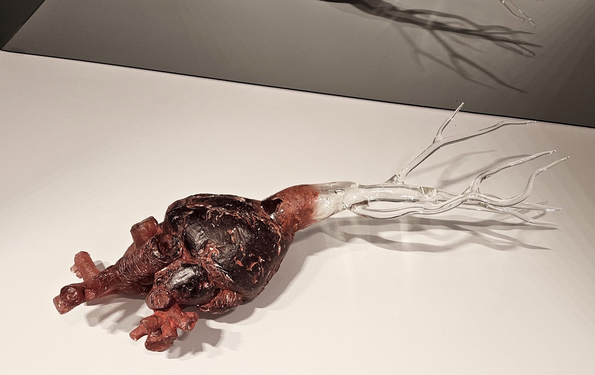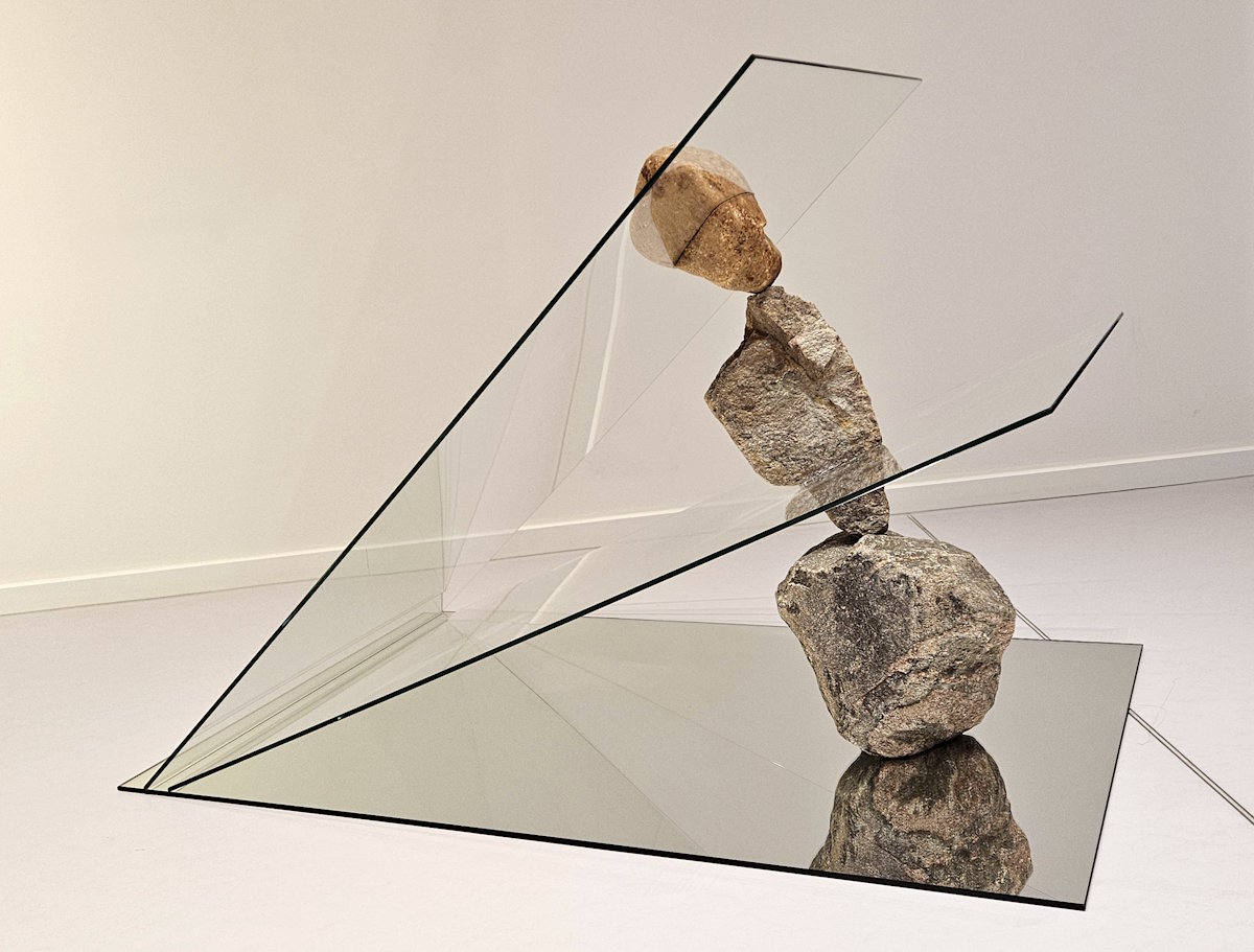 Simone Fezer (*1976) hat mit »Verwurzelt« ein gläsernes Herz mit Wurzelgeflecht geschaffen. Um den Gegensatz zwischen Glasscheiben und Gesteinsbrocken, Zerbrechlichkeit und Massivität geht es in »Hemmungsloser Widerstand« von Alicja Kwade (*1979).