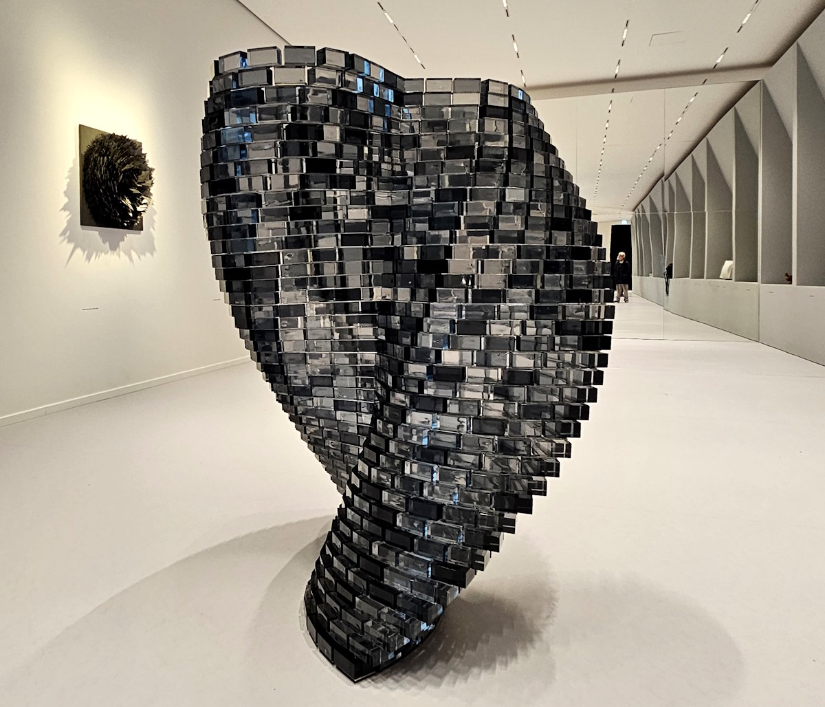 In der BlackBox stoßen wir auf »Alar« von Shirazeh Houshlary (*1955), ein Körper aus schwarzen und grauen Glasziegeln, dessen Form an die Doppelhelix der DNA denken lässt.