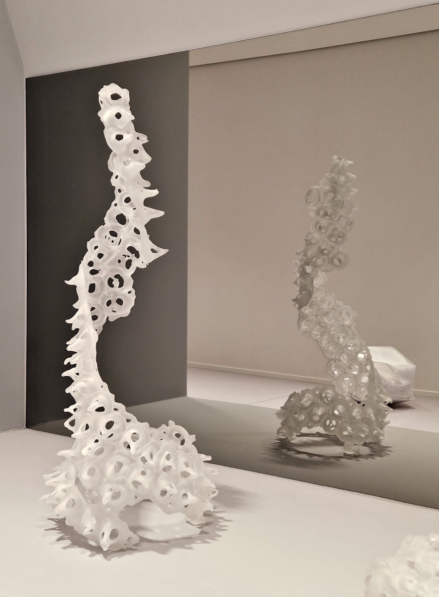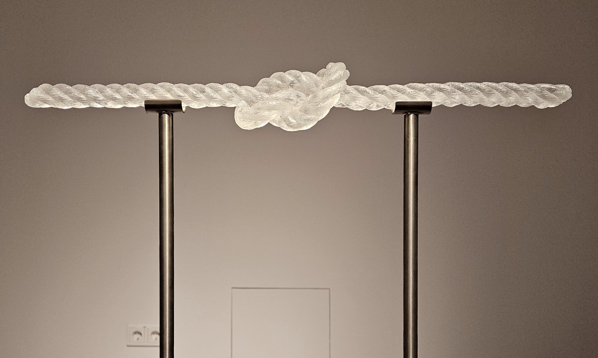 Masahiro Sasakis (*1969) schuf mit »Tensei 0911« eine Figur, die man mit einem paläontologischen Fundstück assoziieren kann. Im Gegensatz zu dieser geschwungenen Form gestaltete Hassan Khan (*1975) mit »The Knot« eine durch einen Knoten unterbrochene schnurgerade Glasplastik.