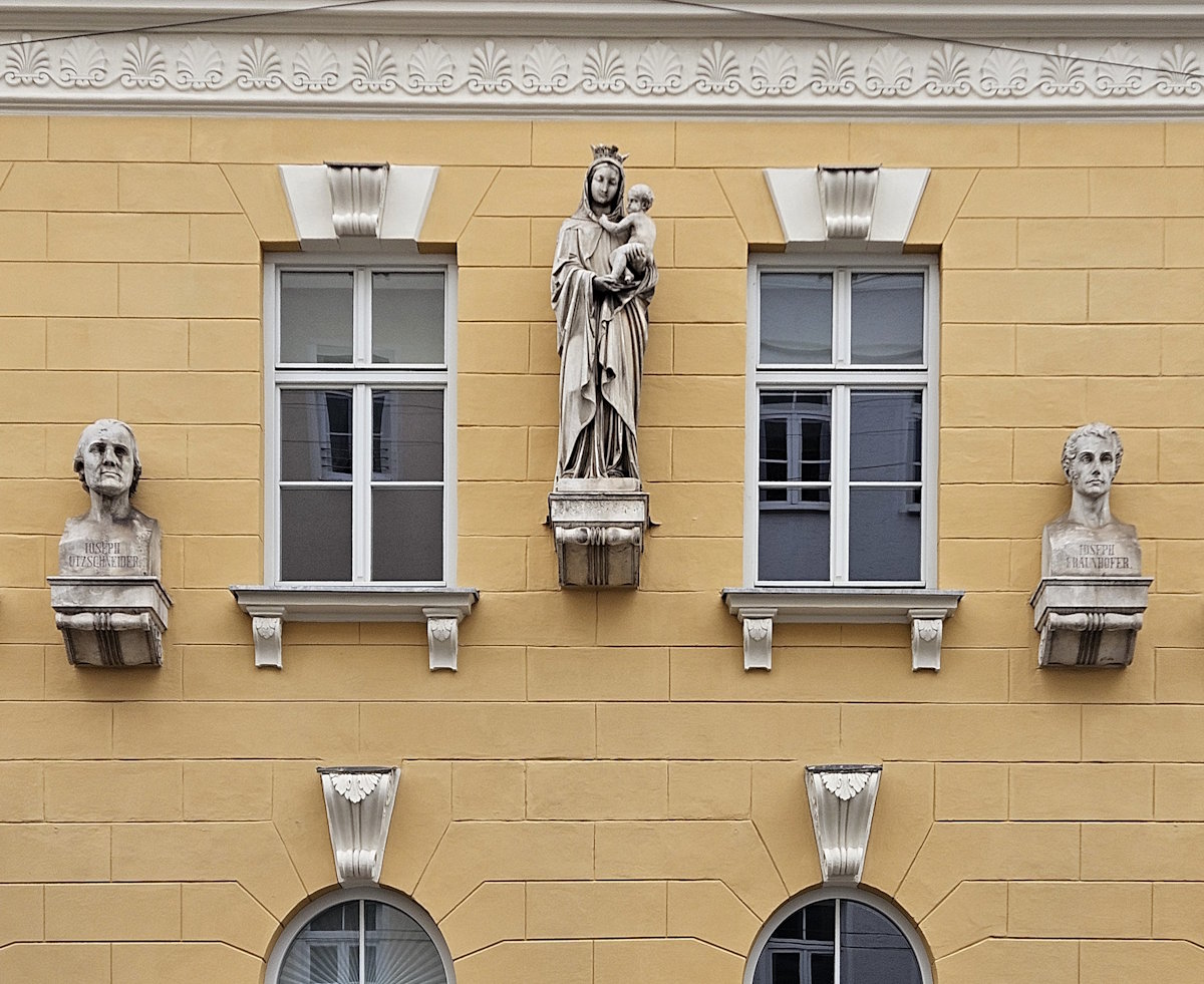 Joseph Fraunhofer (1787 – 1826; 1824 geadelt) war das elfte Kind eines Glasmeisters in Straubing. Seine Mutter starb, als er zehn Jahre alt war, und im Jahr darauf wurde er Vollwaise. Bei seinem Vormund Philipp Anton Weichselberger in München absolvierte er eine Ausbildung zum Spiegelschleifer – und überlebte 1801 den Einsturz des Hauses (→ Gedenktafel in der Passage zum Dom im Kreuzviertel). Der Unternehmer Joseph von Utzschneider (1763 – 1840; 1808 geadelt), der Zeuge der Rettung des 14-Jährigen war, begann ihn zu fördern, und 1806 wurde Joseph Fraunhofer Optiker in dem 1802 von Georg Reichenbach und Joseph Liebherr gegründeten Mathematisch-Feinmechanischen Institut, an dem sich Joseph von Utzschneider seit 1804 als Investor beteiligte.
