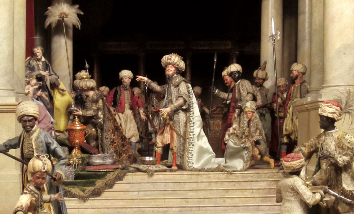 Die Krippe »Anbetung der Könige im Marmorpalast« wurde in der zweiten Hälfte des 18. Jahrhunderts von Giuseppe Sammartino und Lorenzo Mosca in Neapel gestaltet.