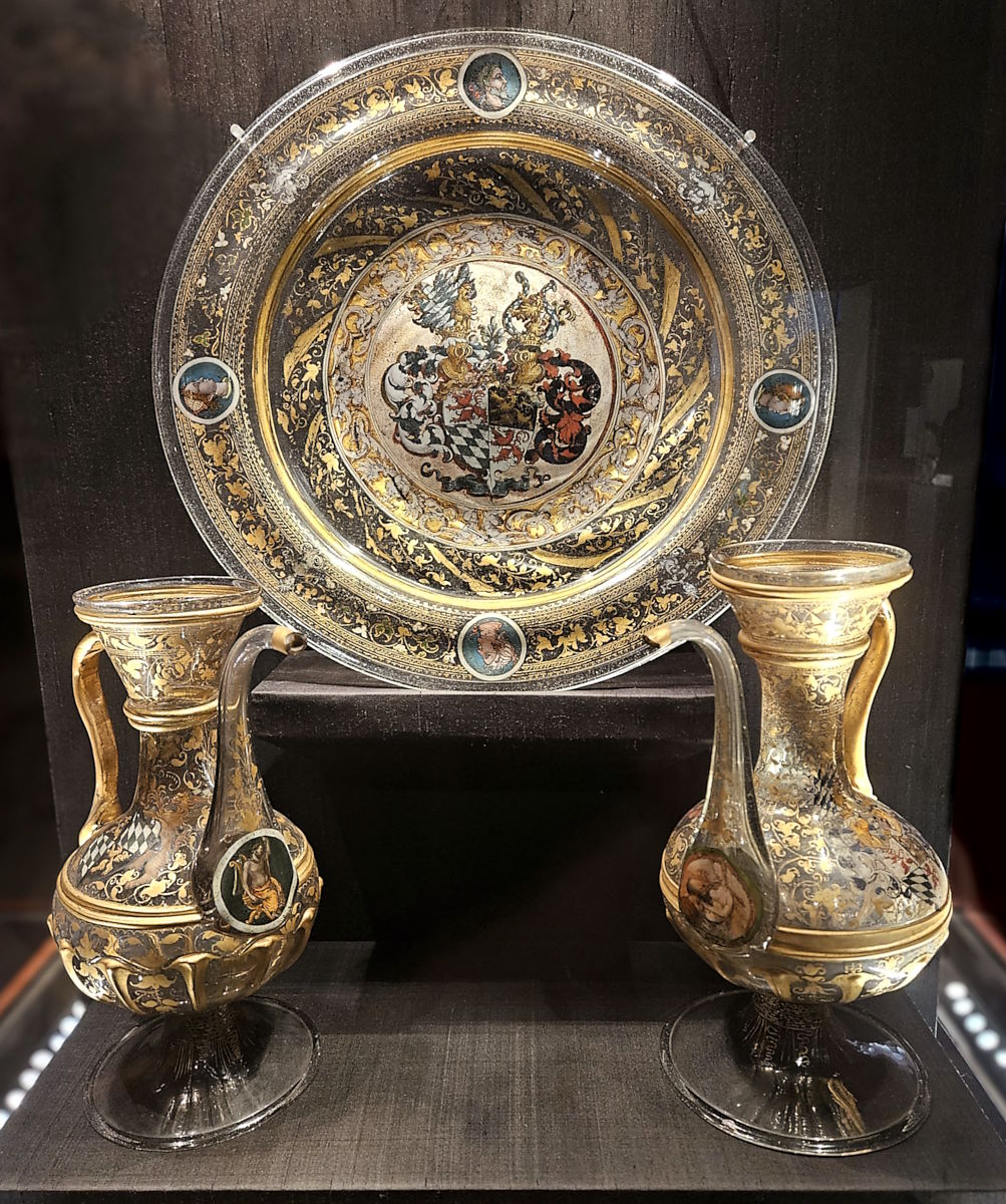 Sowohl der große Wappenteller als auch die beiden Schnabelkannen wurden in der Glashütte Hall in Tirol angefertigt, der Teller 1536, die Kannen 1535 bzw. 1538. Die Dekors des kalt bemalten Sodaglases könnten von Paul Dax (1503 – 1561) stammen.