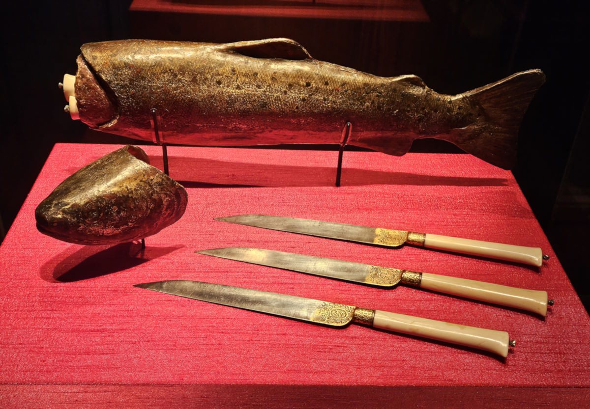 Um 1570, vermutlich in Italien, entstand das im Bayerischen Nationalmuseum ausgestellte Leder-Futteral in Form einer Forelle für sechs Messer mit Bein-Griffen.