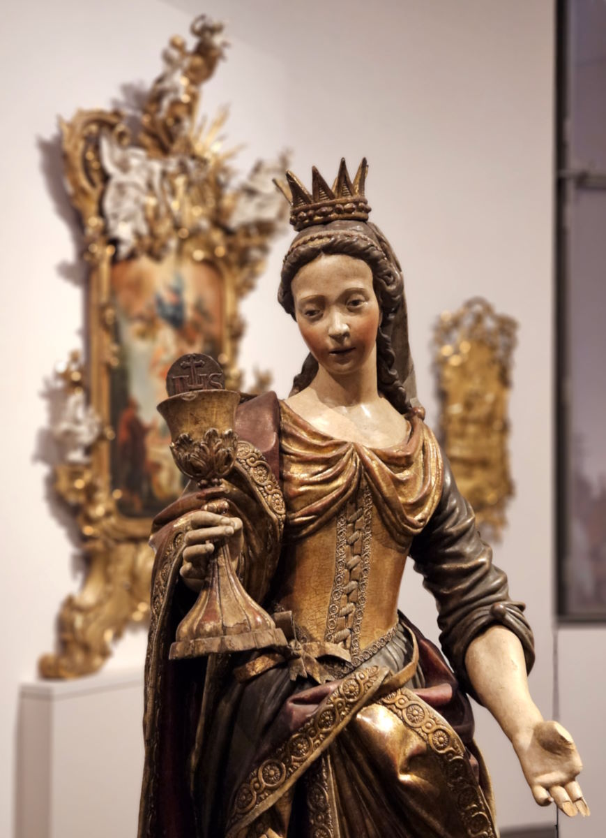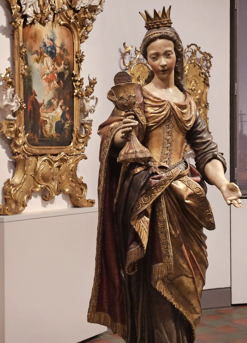 Der Bildhauer Friedrich Theiler (1748 ‒ 1826) gestaltete um 1770/80 in Bamberg die Figur der hl. Barbara aus Laubholz.