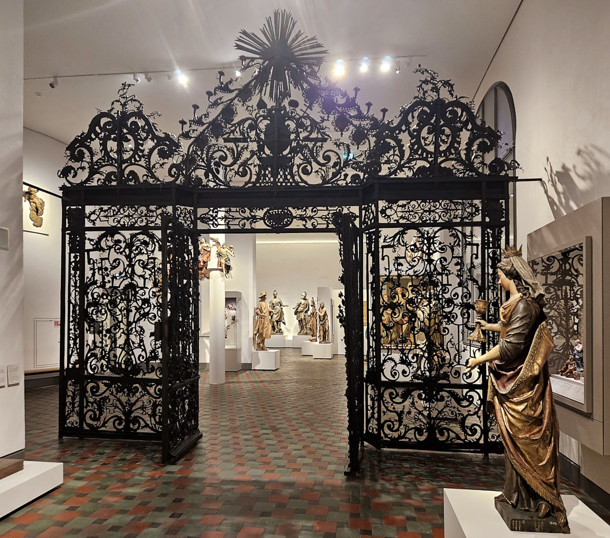 Das um 1750 geschaffene eiserne Chorgitter im Saal 42 des Bayerischen Nationalmuseums stammt aus der Dominikanerkirche St. Blasius in Regensburg. (Im Hintergrund sind die Götterstatuen von Johann Baptist Straub zu sehen, rechts vorne steht die von Friedrich Theiler gestaltete Figur der hl. Barbara.)