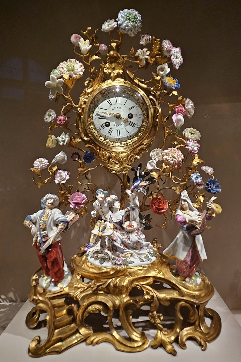 Pariser Händler ließen im 18. Jahrhundert Luxusgüter wie Meißener Porzellanfiguren mit feuervergoldeten Bronzemontierungen und französischen Porzellanblüten zu dekorativen Ensembles kombinieren. So entstand auch diese Prunkpendule. Johann Joachim Kändler (1706 – 1775), einer der bedeutendsten Modelleure der Meißener Porzellanmanufaktur, und sein Mitarbeiter Peter Reinicke (1711 – 1768) gestalteten 1744/45 die Modelle: Ein musizierendes Türkenpaar flankiert eine Dame im höfischen Kostüm, die einen Papagei mit Kirschen füttert und von einem Harlekin nachgeahmt wird. Die Montierung erfolgte in Paris, und Antoine-Robert Bunon lieferte das Uhrwerk. Als Entstehungszeit gibt das Bayerische Nationalmuseum 1744 bis 1787 an.