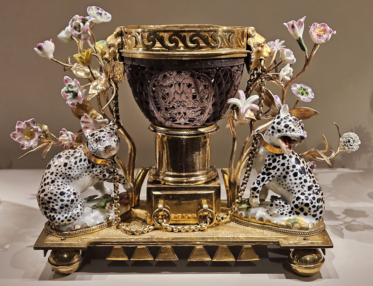 Das Duftgefäß mit einem Leopardenpaar wurde vermutlich um 1760/70 in Frankreich montiert. Das Gefäß stammt aus Ostasien, der Blumendekor aus Frankreich, und die Tierfiguren wurden in der Porzellanmanufaktur Meißen geformt, wahrscheinlich nach Modellen von Johann Joachim Kändler.
