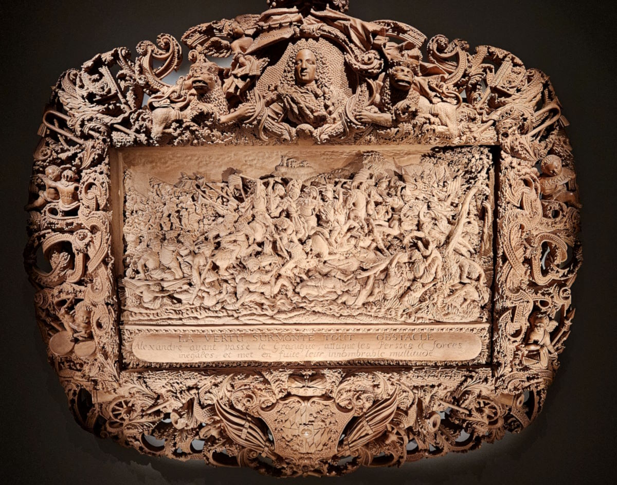 Johann Leonhard Bauer (1681 – 1760) wird das um 1715 angefertigte figurenreiche Laubholz-Relief zugeschrieben, das veranschaulicht, wie Alexander der Große 334 v. Chr. den Fluss Granikos (heute: Biga Çayı) überschreitet und eine erste Schlacht gegen die Satrapen des Perserkönig Darius gewinnt. Oben im Rahmen ist der bayrische Kurfürst Maximilian II. Emanuel (1662 ‒ 1726) porträtiert, der 1688 mit den kaiserlichen Truppen die Save vor Belgrad überschritt und die Osmanen besiegte.