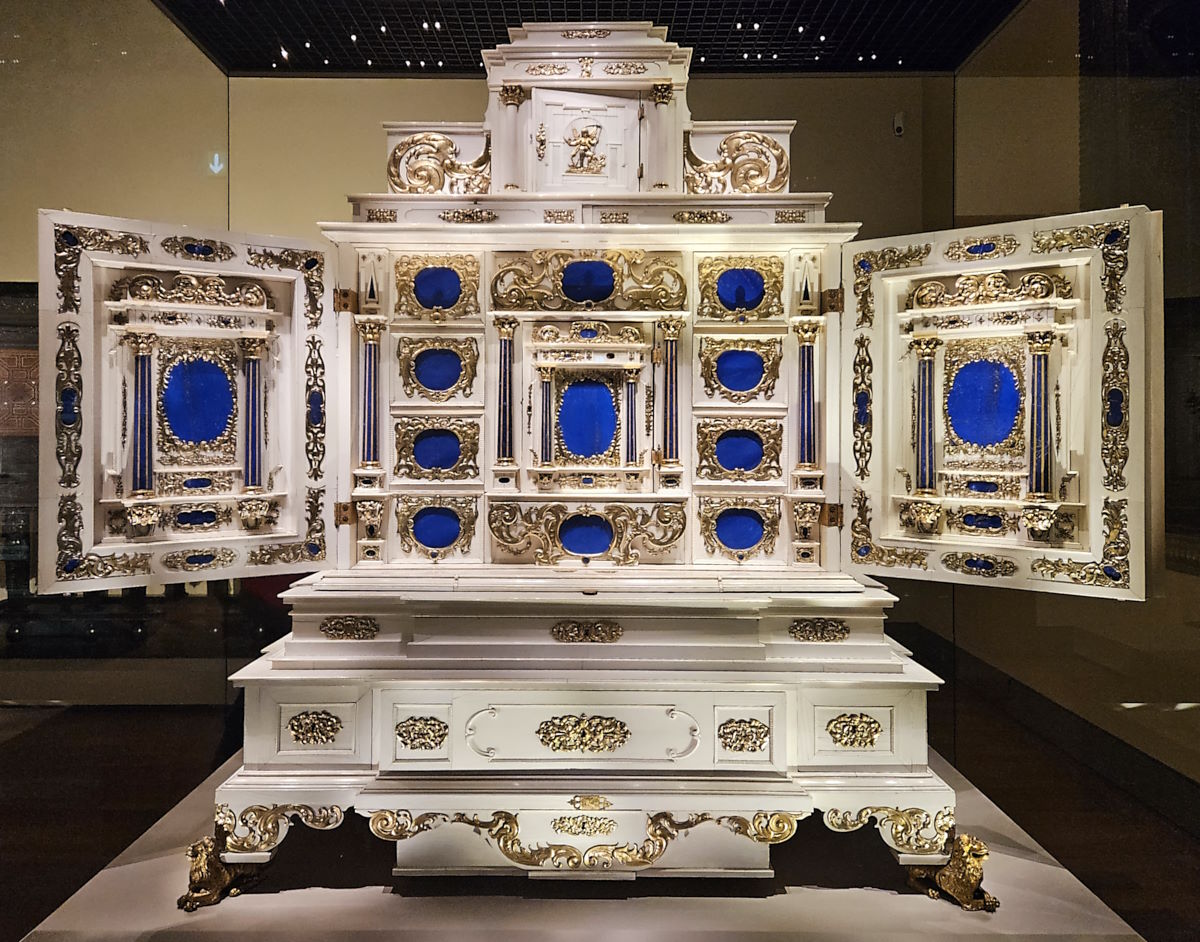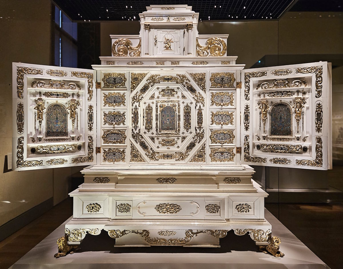 Die aus einer Lavabo-Garnitur stammende Kanne aus vergoldetem Silber wurde um 1580 angefertigt. Die beiden anderen Kunstwerke entstanden um 1600 in Nürnberg: Der Goldschmied Hans Kellner gestaltete die Adam und Eva-Gruppe, und sein Kollege Christoph Jamnitzer schuf den früher als »Mohrenkopfpokal« bezeichneten Deckelpokal.