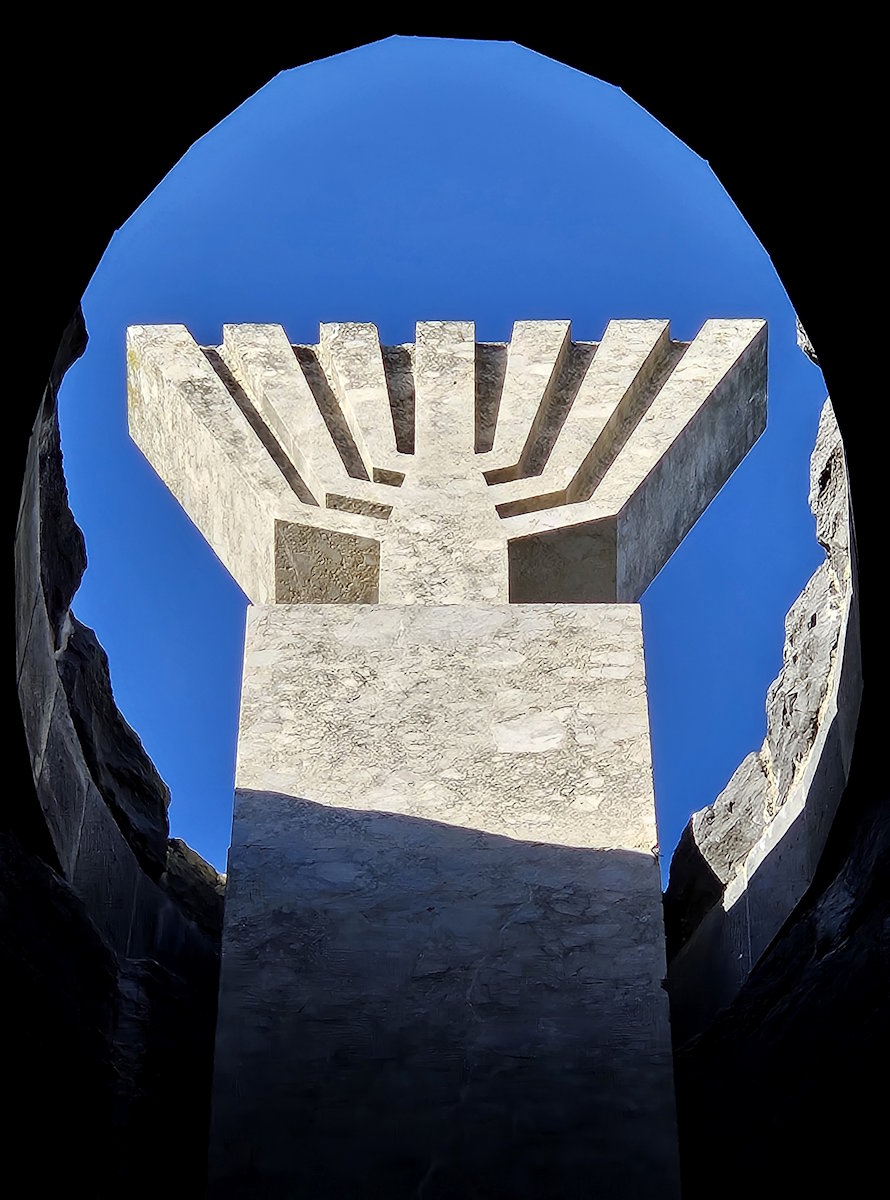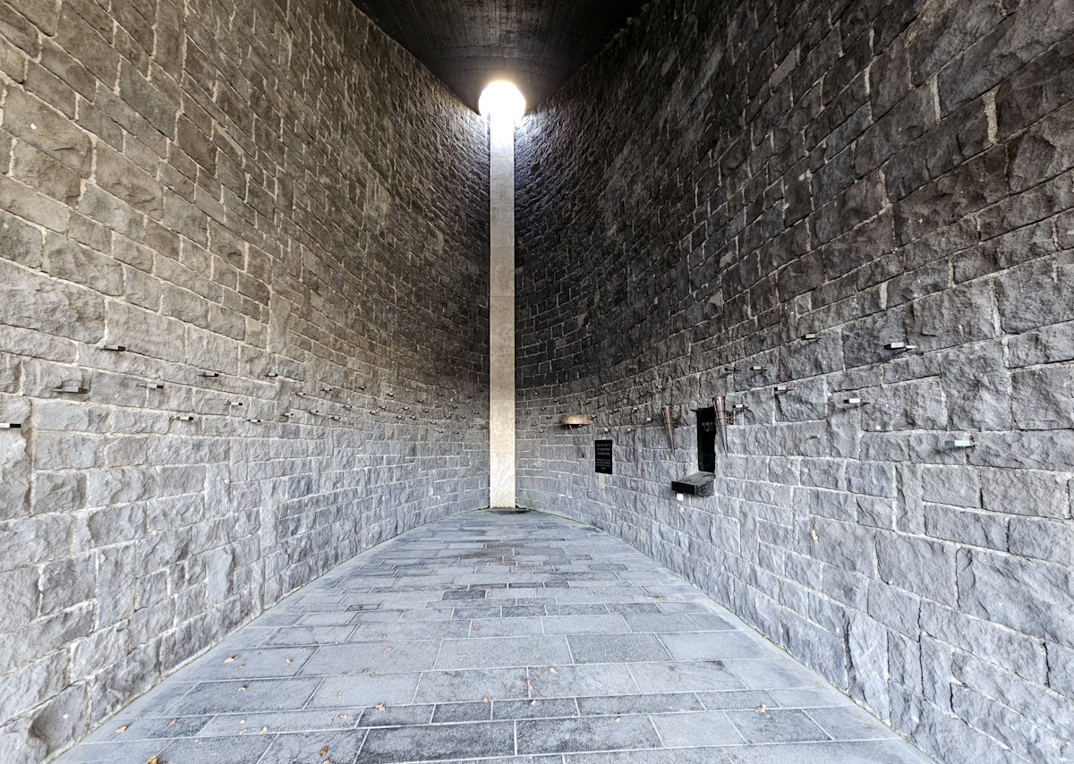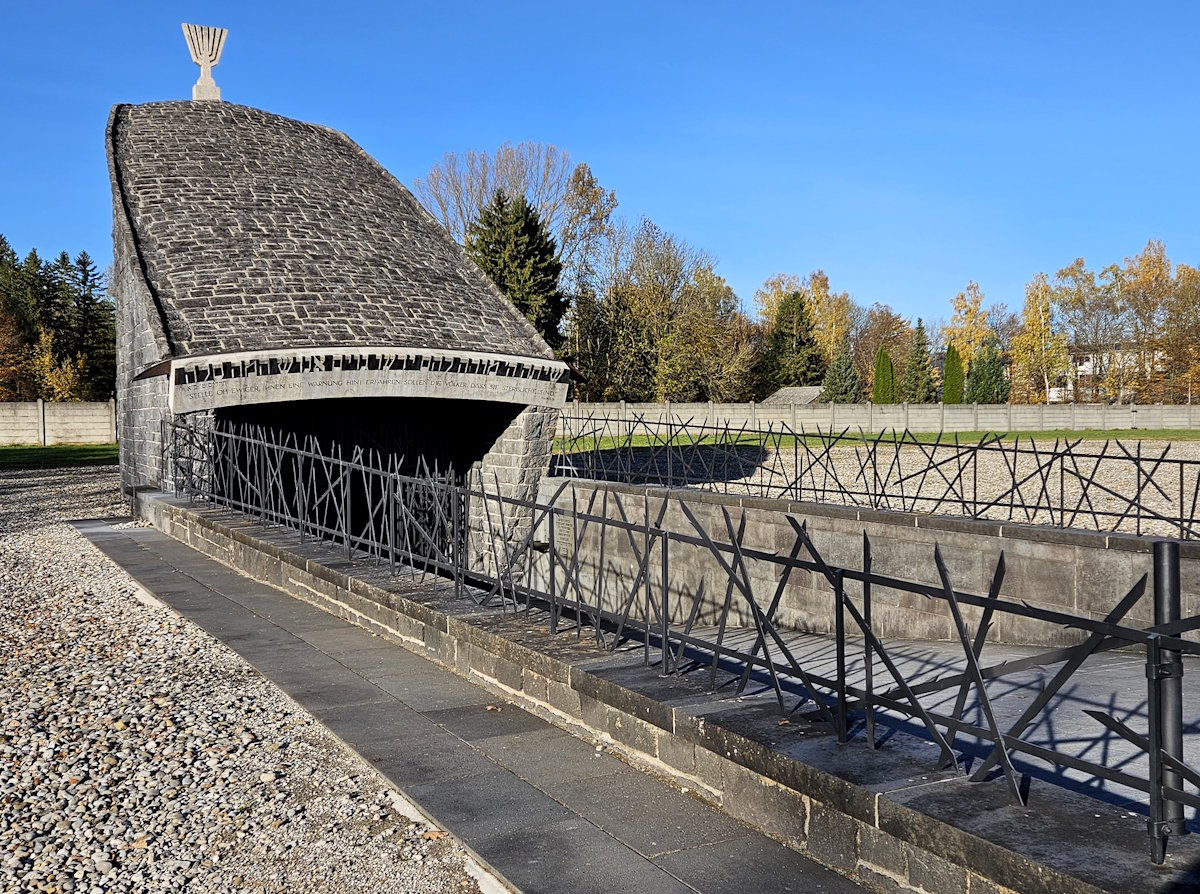 Ebenfalls im Nordteil der KZ-Gedenkstätte Dachau befindet sich seit 1967 das vom Architekten Hermann Zvi Guttmann (1917 – 1977) im Auftrag des Landesverbands der israelitischen Kultusgemeinden in Bayern gestaltete jüdische Mahnmal. Über eine Rampe geht es in die Tiefe. Ganz unten erblickt man hoch oben eine Öffnung zum Himmel und im Licht eine Marmor-Menora.