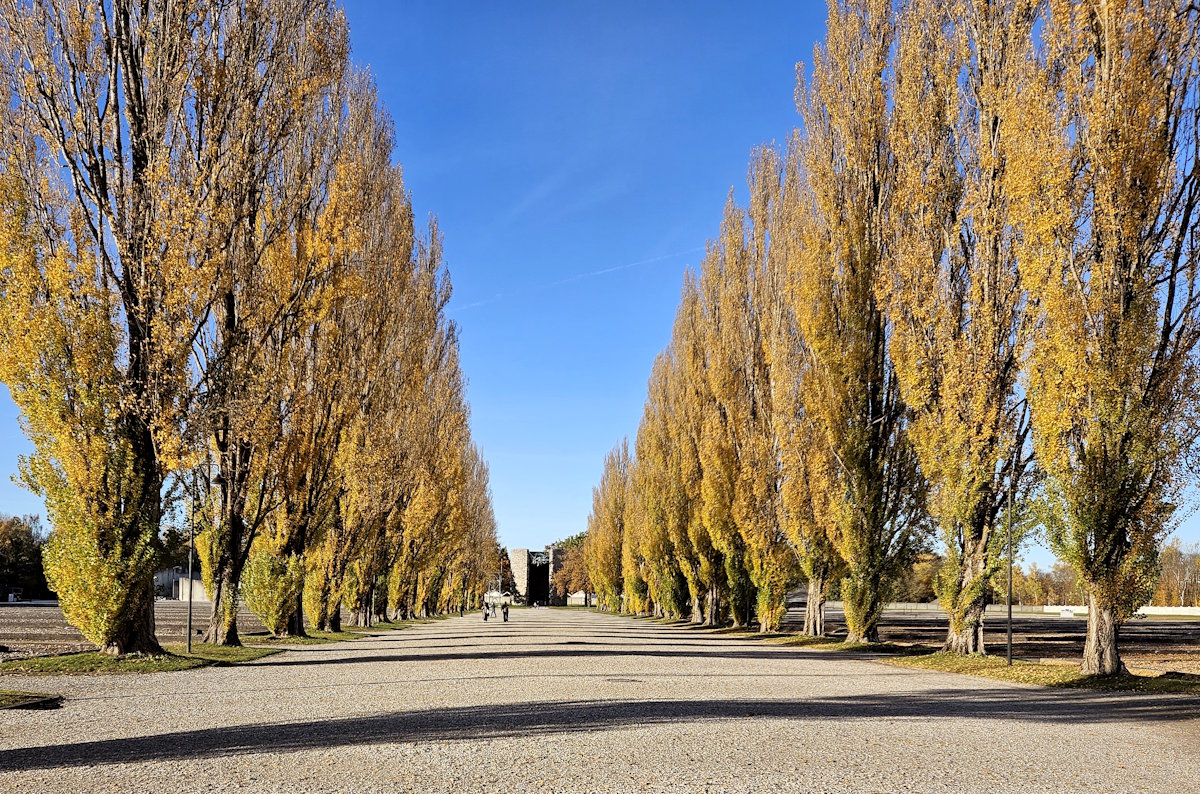 Die Lagerstraße mit Pappelallee verlief zwischen den 34 symmetrisch angeordneten Baracken. Heute führt sie vom Internationalen Mahnmal auf dem ehemaligen Appellplatz zur »Todesangst-Christi-Kapelle«.