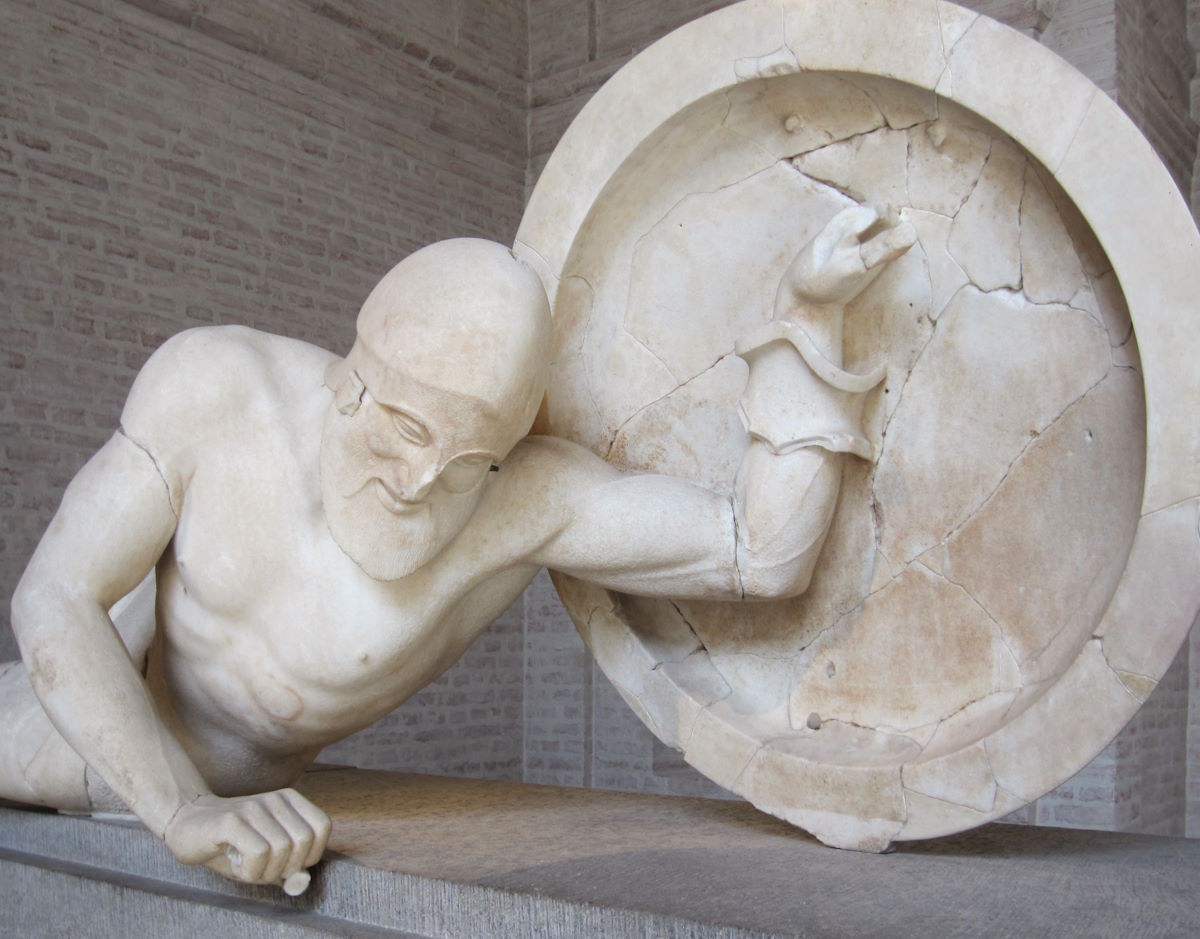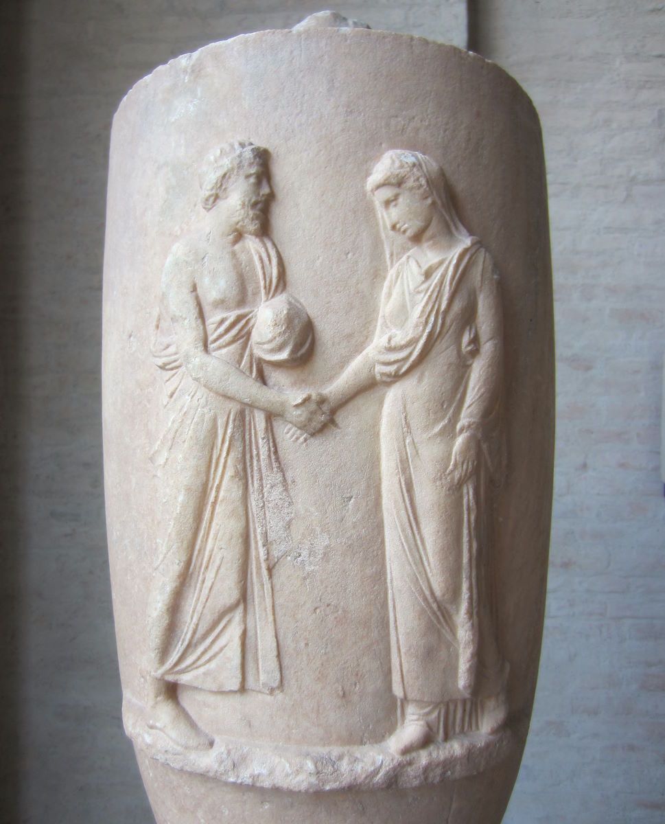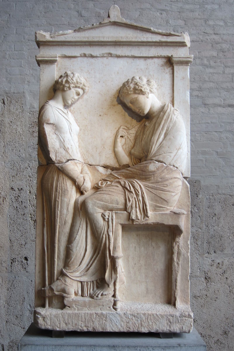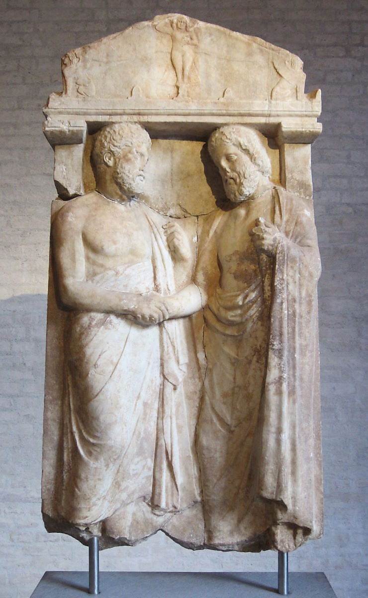 Auf dem um 350 v. Chr. in Attika geschaffenen Grabrelief des Artemon reichen sich der Verstorbene und ein älterer Mann, wohl der Vater, die Hand. Über ihnen beklagt eine Sirene den Toten.