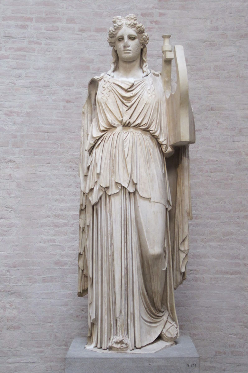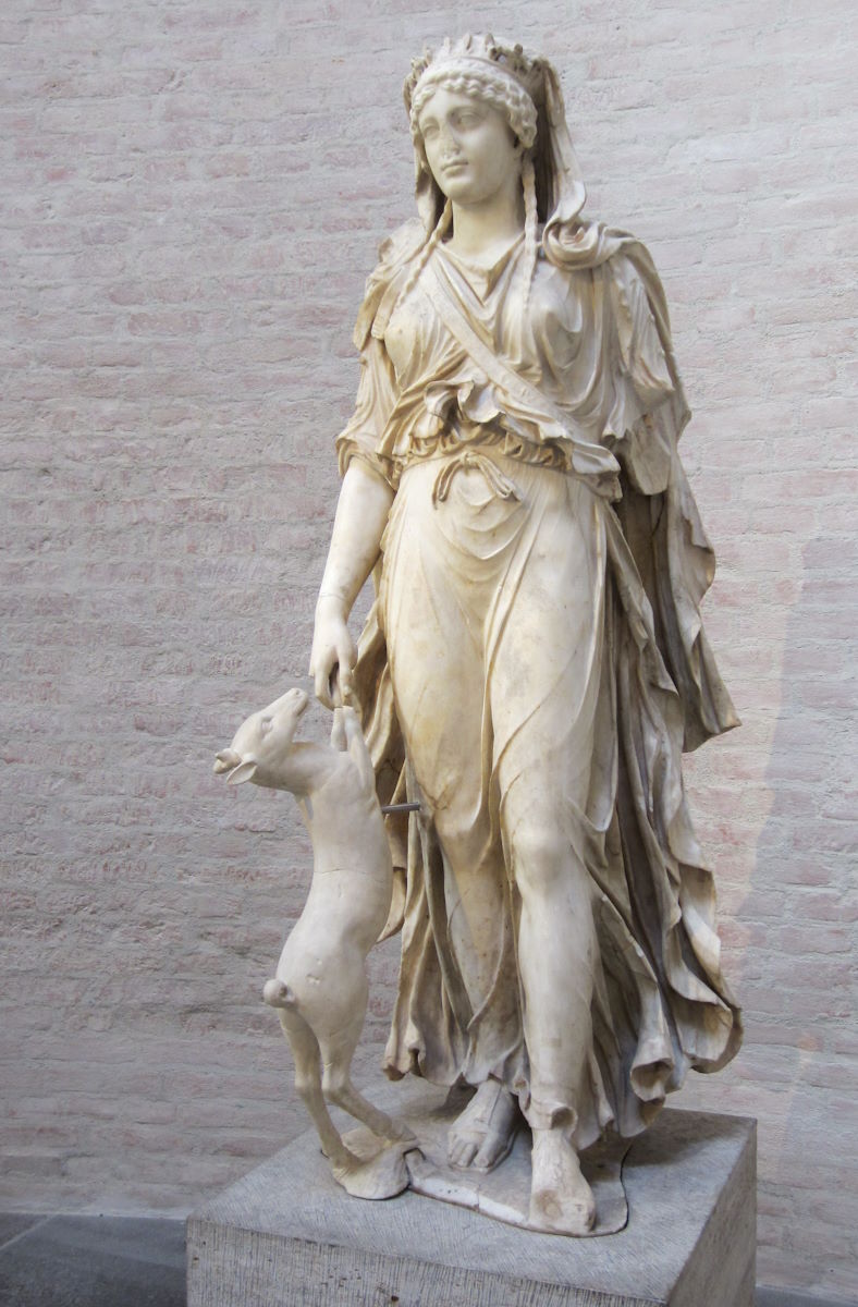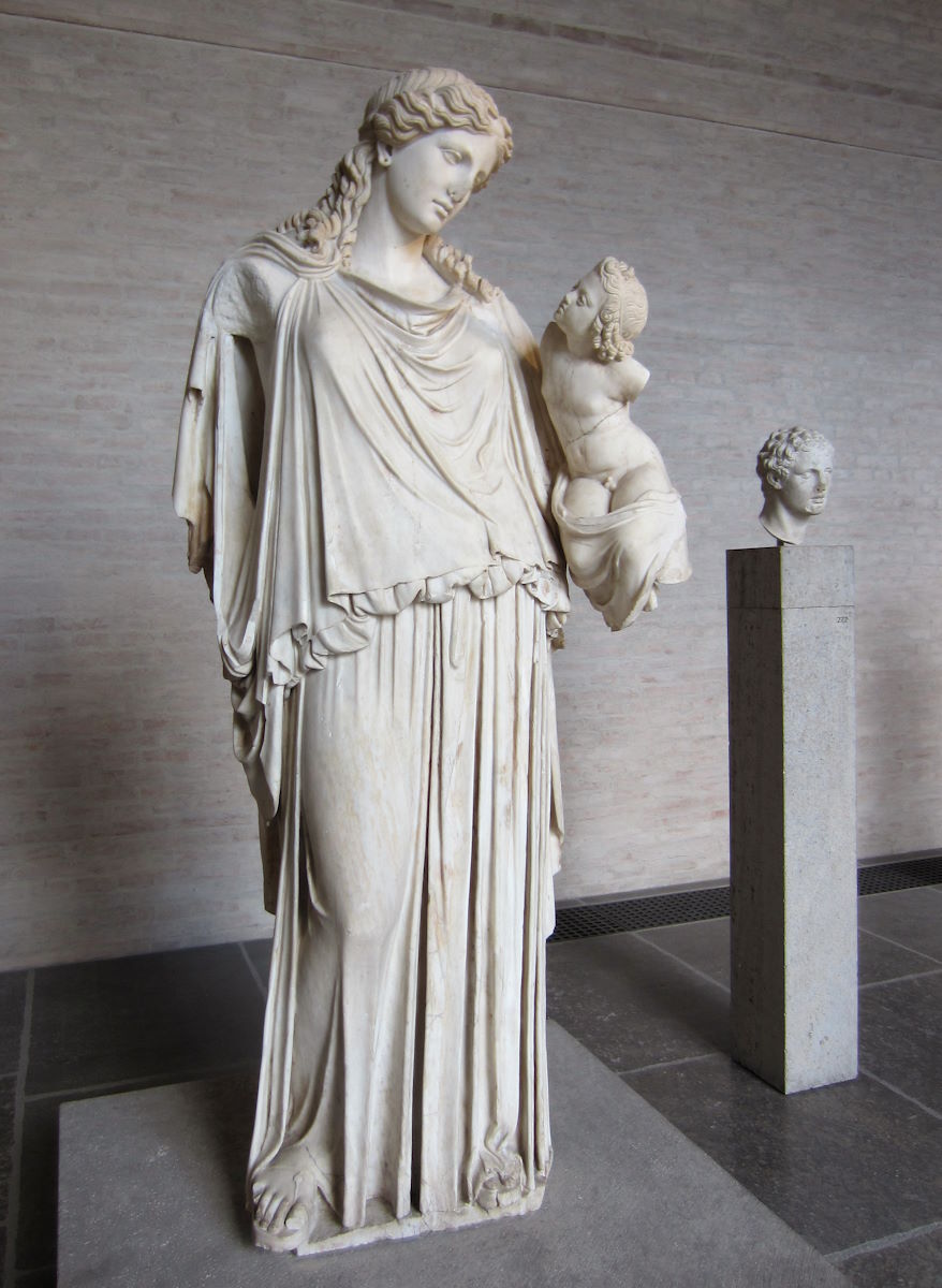 Bei der Friedensgöttin Eirene mit dem kleinen Ploutos auf dem Arm handelt es sich um eine römische Kopie einer Kultstatue des Kephisodotos auf der Agora von Athen aus der Zeit um 370 v. Chr.