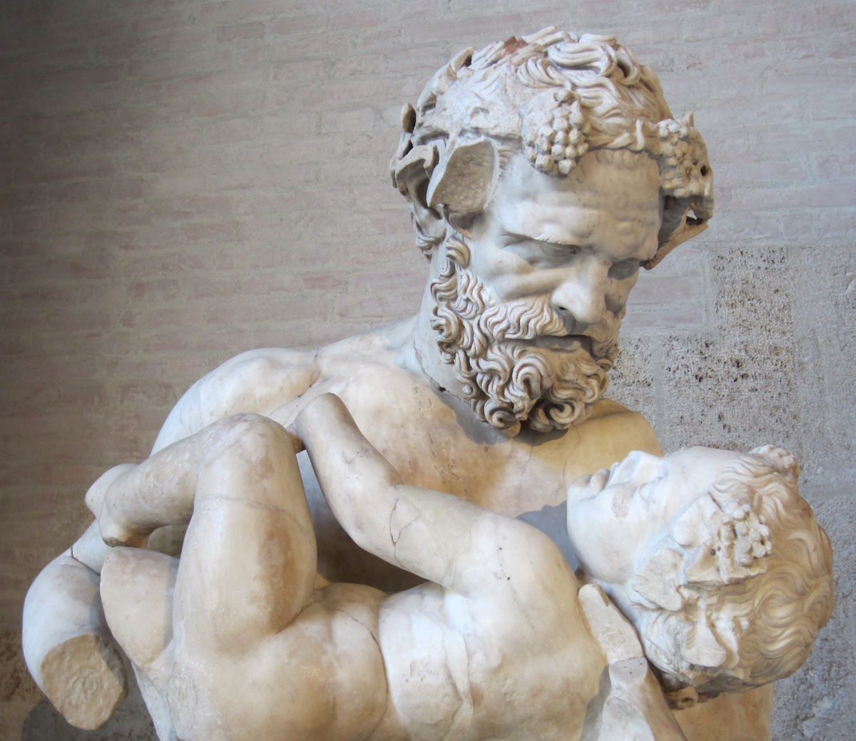 Bei der ungewöhnlichen Marmorstatue des Satyrs, der den kleinen Dionysos auf dem Arm trägt, handelt es sich um eine römische Kopie, möglicherweise eines um 310 bis 300 v. Chr. von Lysipp, dem Hofbildhauer Alexanders des Großen, gestalteten Originals aus Bronze im Übergang von der Spätklassik zum Hellenismus.