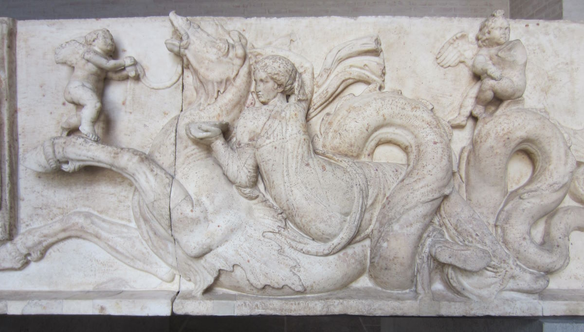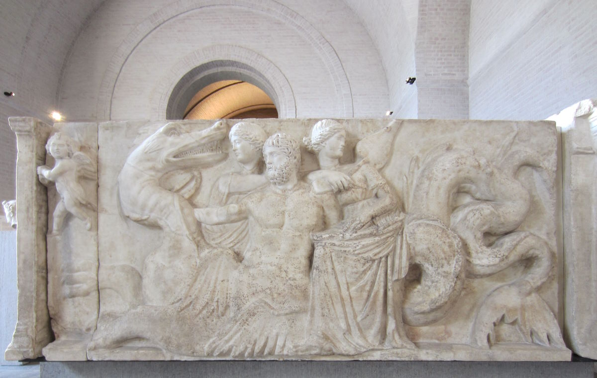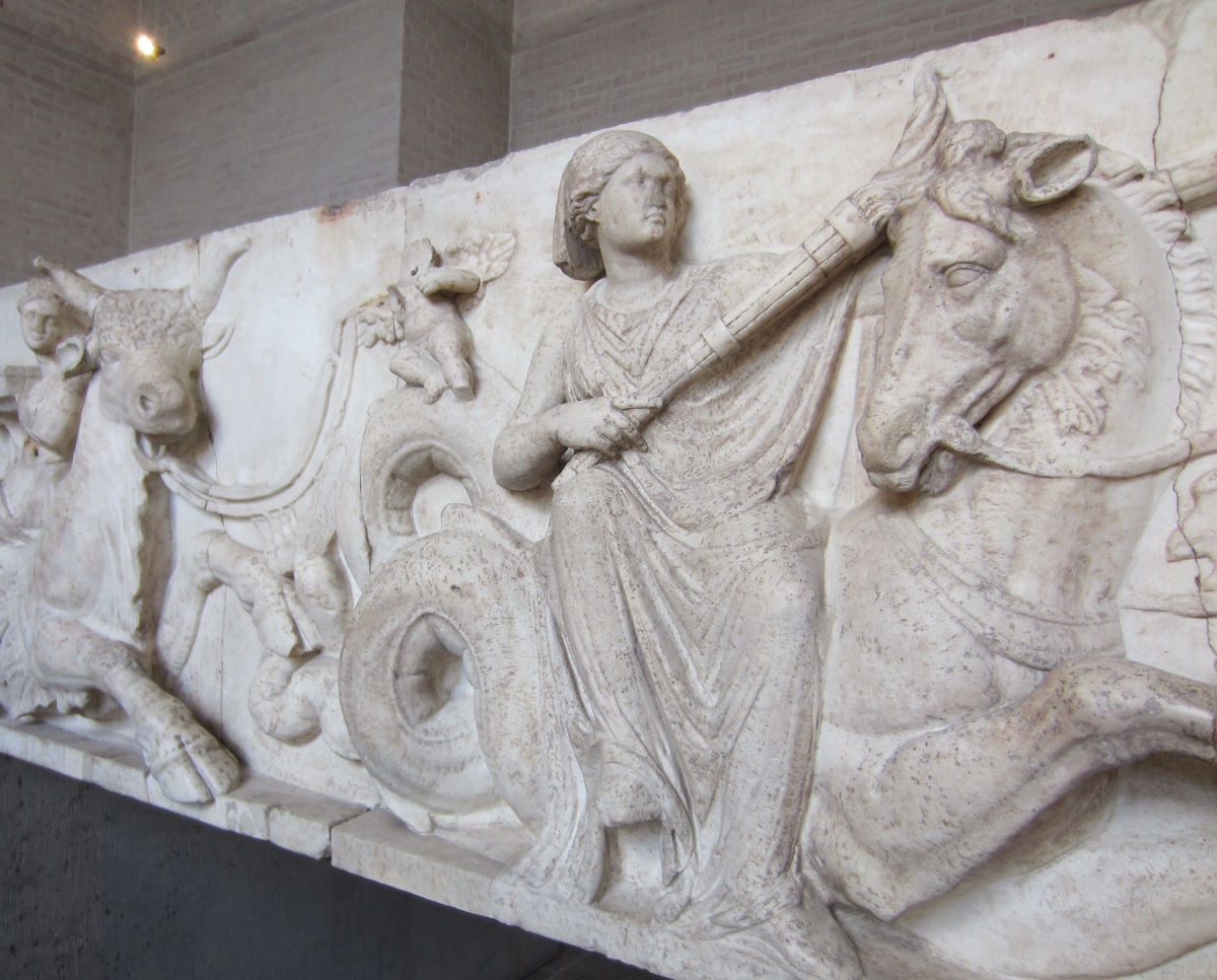 Im Saal der römischen Bildnisse befinden sich Teile des Sockels einer Statuengruppe. Auf der Vorderseite ist eine Szene aus der griechischen Mythologie dargestellt: der Festzug von Tritonen, Nereiden und anderer Meereswesen bei der Vermählung Poseidons mit Amphitrite. Dieser Teil des Reliefs wurde um 150 v. Chr. im Osten Griechenlands angefertigt, bald darauf von einem römischen Feldherrn geraubt und nach Rom abtransportiert. Dort fügte man die in der Glyptothek auf der Rückseite zu sehende Szene einer Steuerschätzung (Census) und eines Opfers für den Kriegsgott Mars hinzu. Weil das wohl in der Amtszeit des um 89 v. Chr. gestorbenen römischen Konsuls Gnaeus Domitius Ahenobarbus geschehen war, kam im 19. Jahrhundert die heute nicht mehr gebräuchliche Bezeichnung »Altar des Domitius Ahenobarbus« für den Fries auf.