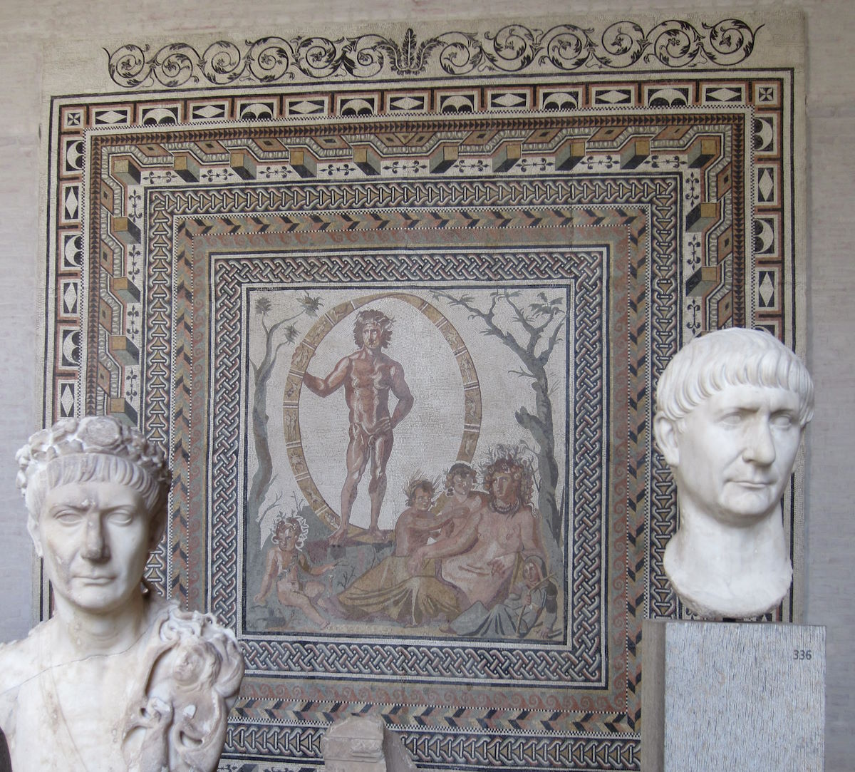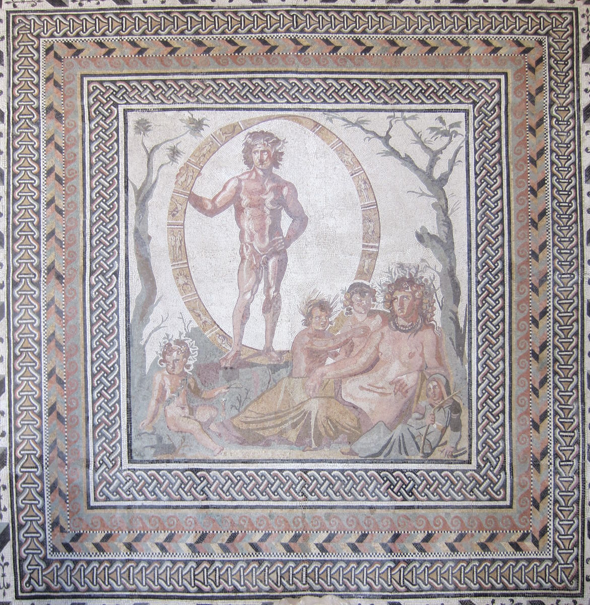 Das Bodenmosaik stammt aus einer römischen Villa bei Sentinum (Sassoferrato) und wurde um 200 – 250 n. Chr. geschaffen. Es zeigt den Gott Aion im Himmelskreis der Tierzeichen zwischen einem Baum im Frühling und einem im Winter. Zu seinen Füßen sitzt die Erdmutter Tellus mit vier die Jahreszeiten symbolisierenden Kindern.