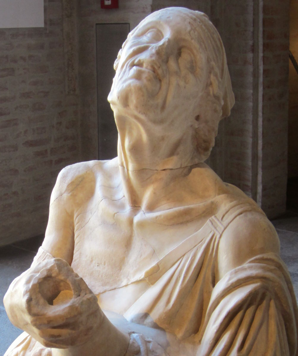Die Figur der in edler, aber derangierter Kleidung betrunken am Boden hockenden alten Frau geht auf ein griechisches Original aus dem späten 3. oder frühen 2. Jahrhundert v. Chr. zurück, von dem nur zwei Marmorkopien erhalten blieben, eine aus dem 2. Jahrhundert n. Chr. in den Kapitolinischen Museen in Rom, die andere aus dem frühen 1. Jahrhundert n. Chr. in der Münchner Glyptothek. Leo von Klenze wollte die 1803 von Kurfürst Karl Theodor nach München geholte, den Verfall darstellende Statue nicht aufstellen; das wagte erst Adolf Furtwängler 1895. Sie zählt heute ebenso wie Der Knabe mit der Gans und der Barberinische Faun zu den bedeutendsten Exponaten der Glyptothek.