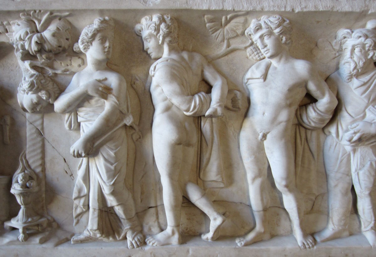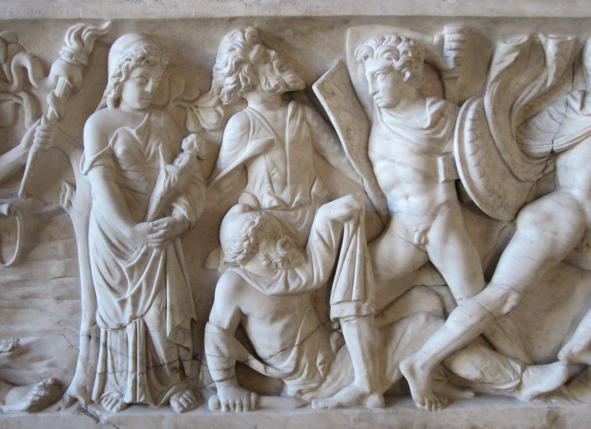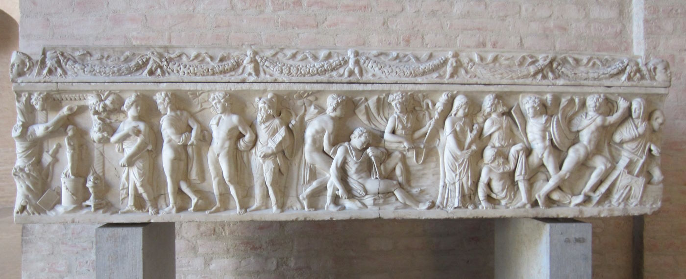 Traditionell kremierte man Tote in Rom. Erst zu Beginn des 2. Jahrhunderts n. Chr. verbreitete sich die bis dahin nur bei wenigen aristokratischen Familien vorgekommene Körperbestattung im Sarkophag. Bei den Darstellungen auf den Marmorsarkophagen wurde oft auf griechische Motive zurückgegriffen, hier zum Beispiel auf den Mythos, dem zufolge Apollon und Artemis die vierzehn Kinder der Niobe töteten.