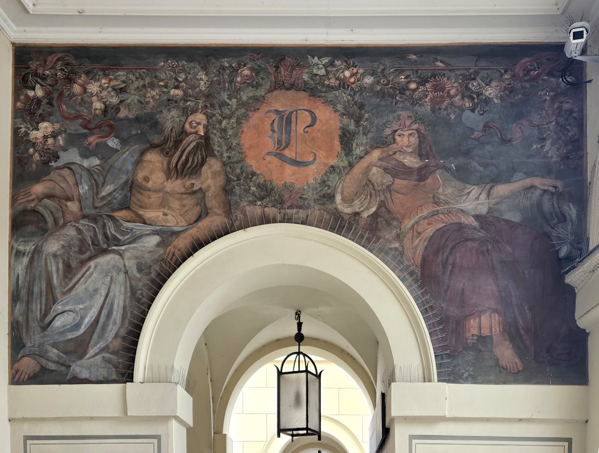Nachdem Leo von Klenze das Hofgartentor mit den Arkaden am Odeonsplatz errichtet hatte, schufen der Hofmaler Peter von Cornelius* und seine Schüler 1826 bis 1829 eine Reihe von 18 Fresken zu Themen aus acht Jahrhunderten bayrischer Geschichte. (2016 wurden sie restauriert.) Daneben malte Carl Rottmann (1797 – 1850) italienische Landschaften (1829 bis 1833). Diese Fresken sind inzwischen im Allerheiligengang der Residenz zu finden, und Carl Rottmanns 1838 bis 1850 für die Nordarkaden gemalten griechische Landschaften befinden sich in der Neuen Pinakothek.