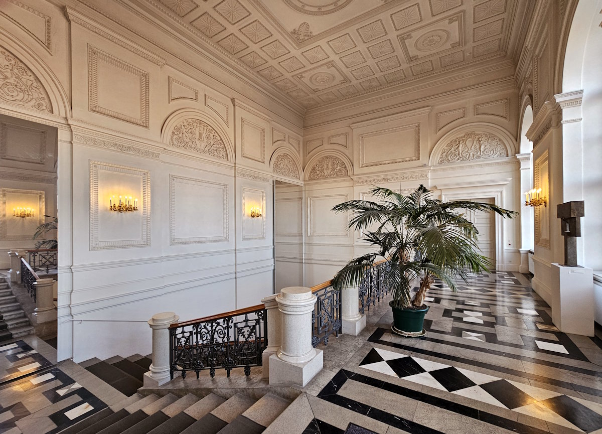 Er beauftragte den jungen Architekten Erwin Schleich* mit dem Wiederaufbau des Preysing-Palais zwischen Viscardigasse (»Drückebergegasse«), Theatinerstraße, Feldherrnhalle und Residenzstraße als Büro- und Geschäftshaus. Bis 1960 dauerten die von Hermann Hartlaubs Bauunternehmen unter Leitung von Fritz Deck und Paul Loch durchgeführten Arbeiten. Erwin Schleich schreibt in seinem Beitrag zu Gisela Vits’ Buch »Das Preysing Palais«, es sei »eine rechte Bauhütte entstanden«. Künstler und Kunsthandwerker restaurierten beispielsweise den Stuck und das Treppengeländer.