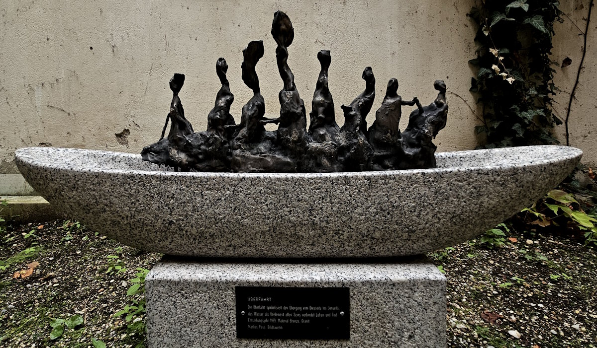 Innenhof des Palais Lerchenfeld: St.-Georgs-Brunnen von Ernst Laurenty, »Die Überfahrt« von Marlies Poss (Fotos: Oktober 2025)