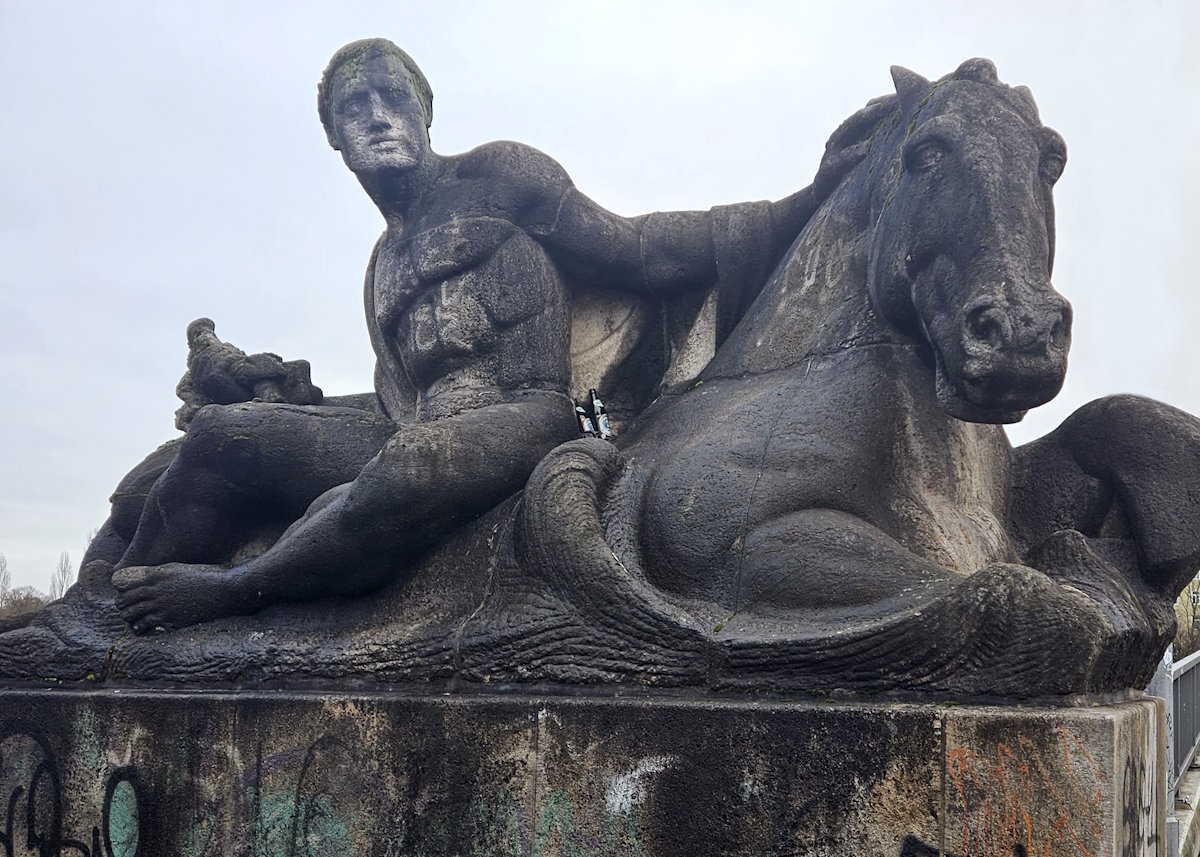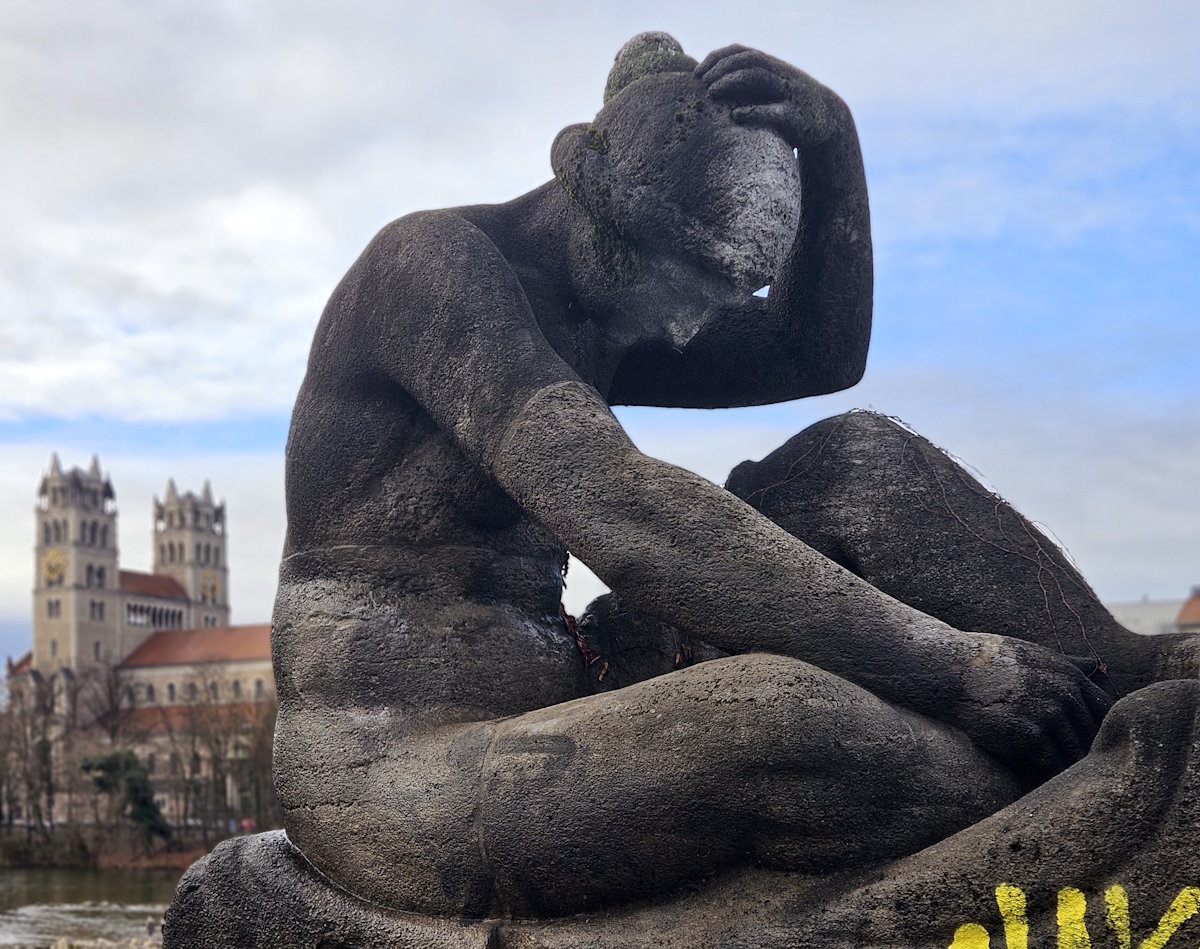 Der Münchner Bildhauer und Kunsttheoretiker Adolf von Hildebrand* (1847 – 1921) gestaltete 1897 bis 1903 einen dem Flussgott Rhein gewidmeten Brunnen, der auf dem Broglie-Platz in Straßburg aufgestellt wurde. Nach dem Einmarsch der Franzosen 1918 in Straßburg baute man die Anlage 1919 ab. Die Bronzeskulptur erhielt München 1929 im Austausch gegen eine andere Brunnenfigur (»Meiselokker-Brunnen«). Drei Jahre später wurde sie mit anderen Originalteilen und Nachbildungen des ursprünglichen Brunnens nördlich der Ludwigsbrücke aufgestellt: Auf der Insel.