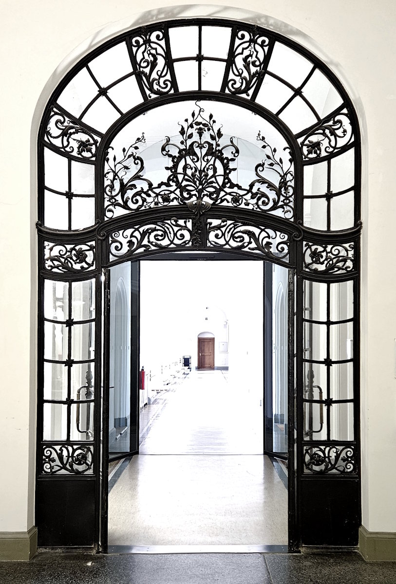 Auf dem Giebel der Südfassade an der Prielmayer Straße befindet sich die von dem Bildhauer Balthasar Schmitt (1858 – 1942) geschaffene Figurengruppe »Gerechtigkeit«: Justitia, Unschuld und Laster.