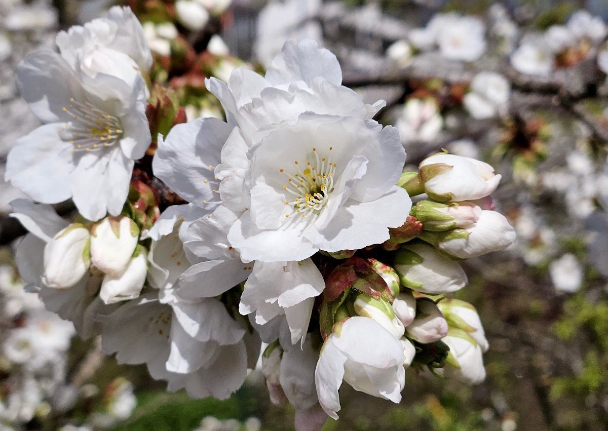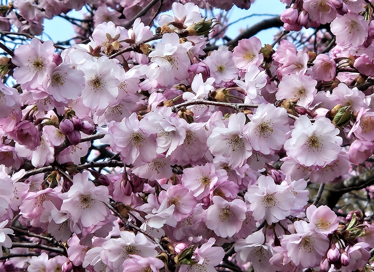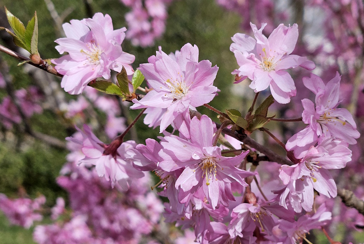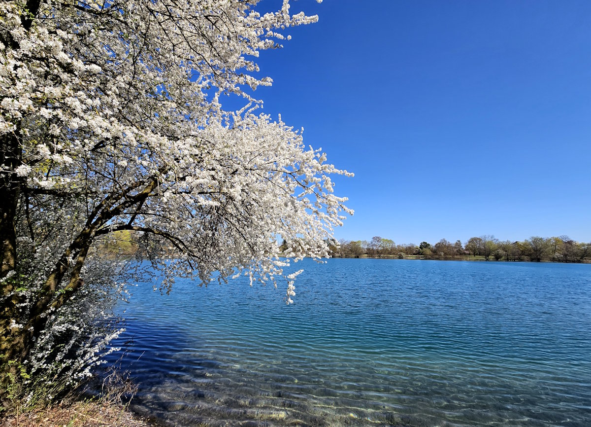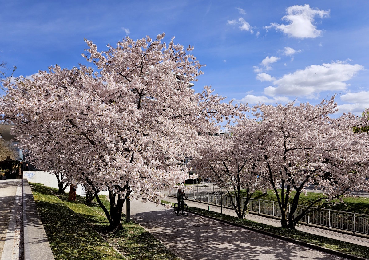 Im Petuelpark gibt es zwei Areale mit Kirschbäumen. Auf Höhe der Klopstockstraße blühen sie weiß, und bei dem 2004 von Raimund Kummer* gestalteten Kunstwerk → »Augen für einen am Baum angeketteten Klappstuhl« am westlichen Rand des Petuelparks entfaltet sich im Frühjahr ein rosafarbiges Blütenmeer.