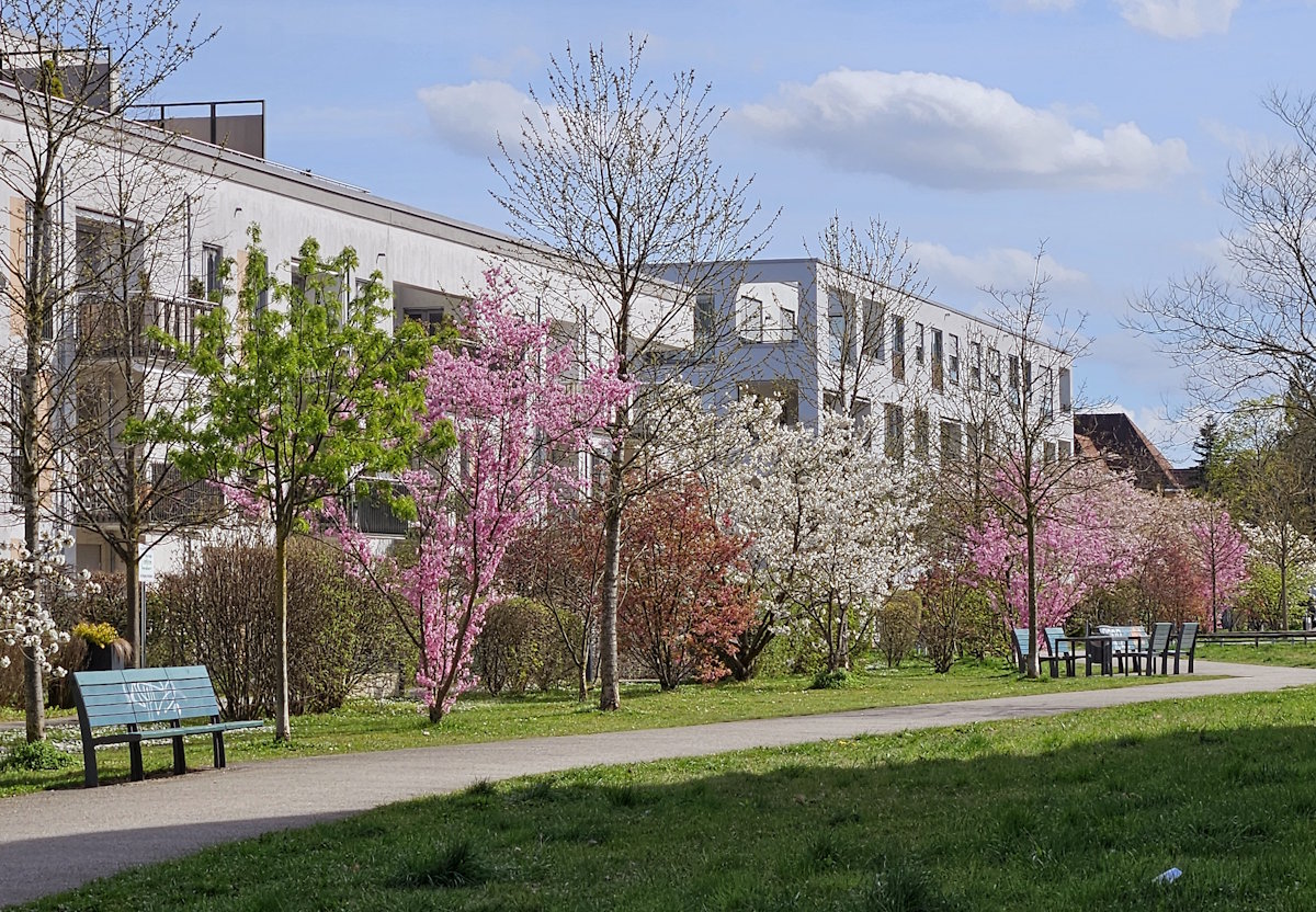 Kirschbäume blühen auch vor dem Caritas-Altenheim St. Nikolaus in der Osterwaldstraße 25 (und im Innenhof).