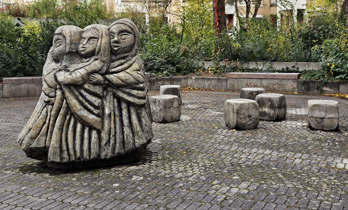 Im Knick der Nadistraße (zwischen den Hausnummern 24 und 26) im Olympiadorf stößt man auf eine Plastik, über die seit langem gerätselt wird. Augenscheinlich stellt das abstrakte Kunstwerk ein heterogenes (Liebes-)Paar dar.