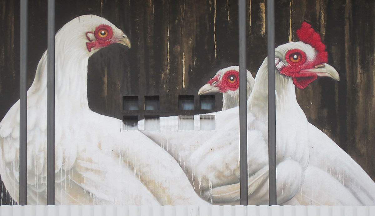 Matthias Mross bemalte im Herbst 2023 die 250 m² große Fassade eines zum Abbruch vorgesehenen Gebäudes in der Agnes-Bernauer-Straße 51 (Ecke Friedenheimer Straße) mit riesigen Hühnern. (Inzwischen ‒ Juli 2025 ‒ befindet sich dort eine Baugrube.)