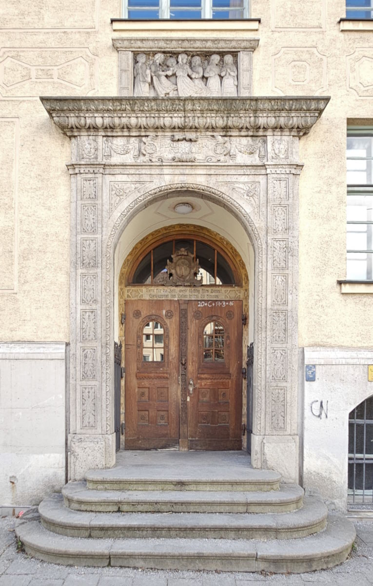 Die Fassade des Wohngebäudes Friedenheimer Straße 18 ‒ an der Kreuzung mit der Veit-Stoß-Straße ‒ ist mit Reliefs verziert.