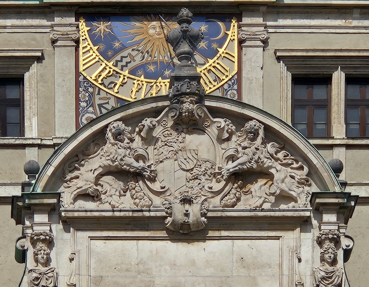 Ludwig Franz Spreither baute den 1907 bezogenen Jugendstil-Eckbau in der Thierschstraße 14. Über dem abgebildeten Relief steht: »Der Wucherer wenn seinen Himmel baut feilscht um den Blumenstraß seiner Braut«.