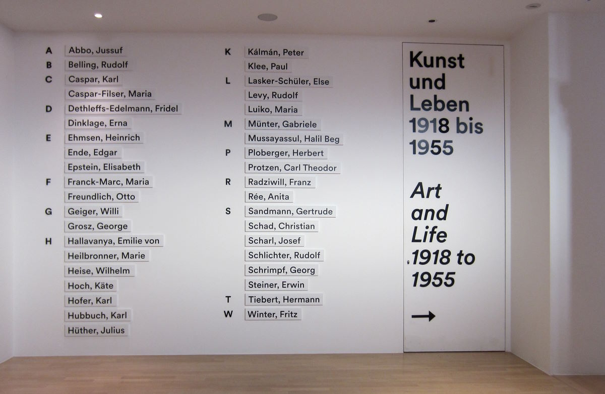 Vom 15. Oktober 2022 bis 16. April 2023 fand in der Städtischen Galerie im Lenbachhaus die Ausstellung »Kunst und Leben. 1918 bis 1955« statt. In diesem Zeitraum waren Menschen in Deutschland mit mehreren Zeitenwenden konfrontiert. Zu sehen waren – alphabetisch geordnete – Werke von Jussuf Abbo bis Fritz Winter.