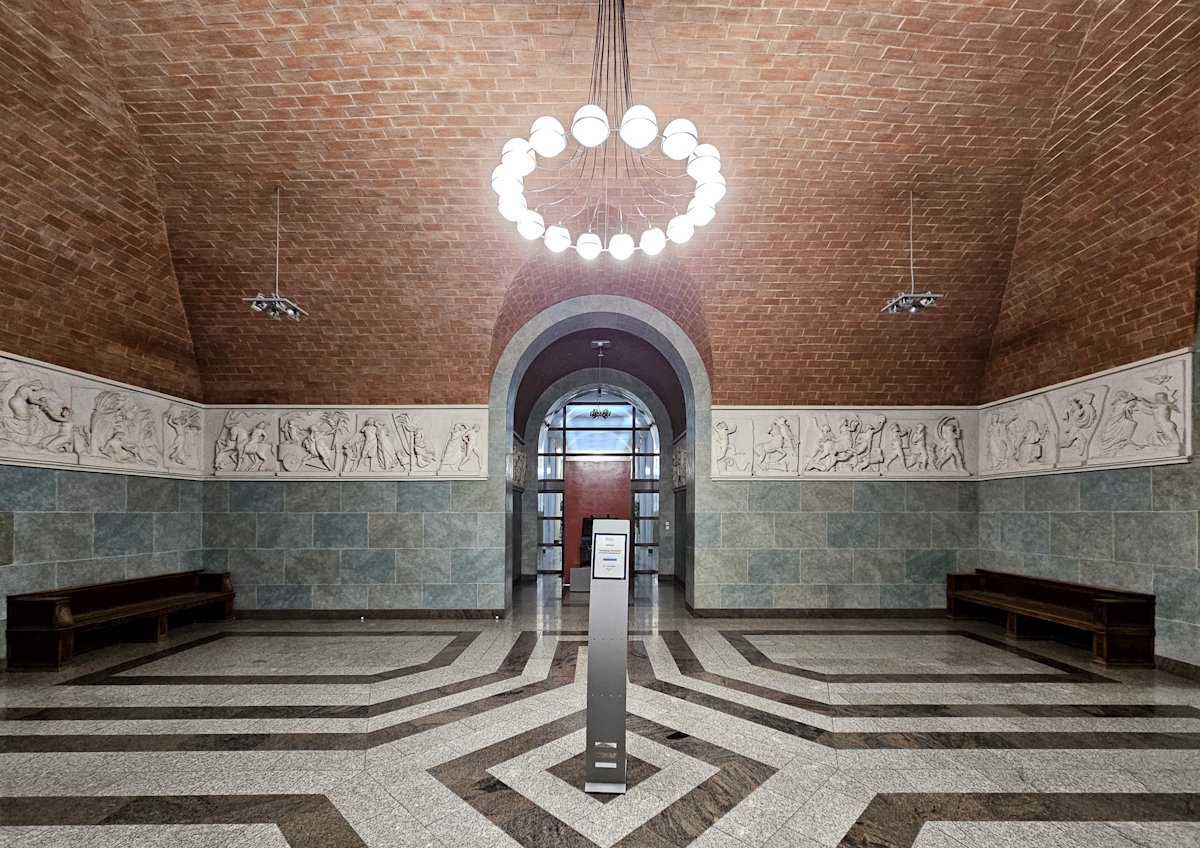Für den Speisesaal des Herzog-Max-Palais hatte Ludwig von Schwanthaler* (1802 – 1848) einen Bacchus-Fries entworfen. Der wurde vor dem Abriss ausgebaut und blieb fast vollständig erhalten. So konnte Theodor Georgii (1883 – 1963) das Kunstwerk in der Eingangshalle der Bank restaurieren.