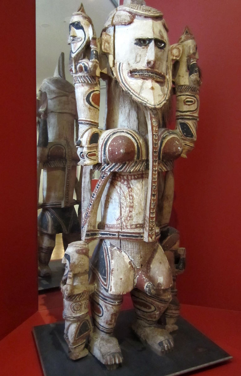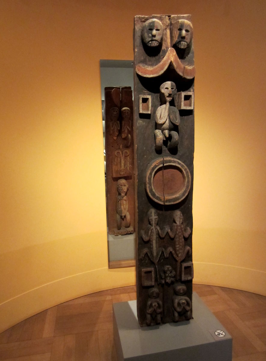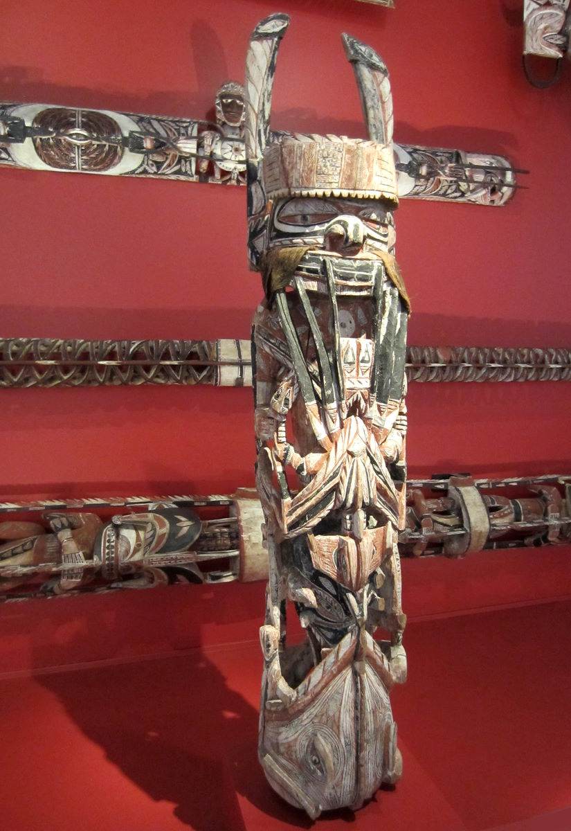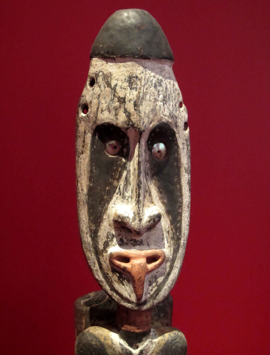 Der 1,52 Meter hohe Wasserstampfer in anthropomorpher Gestalt (von dem hier nur der Kopf zu sehen ist) wurde vor 1913 in Papua-Neuguinea geschaffen (Dorf Kanduonum am Mittleren Sepik).