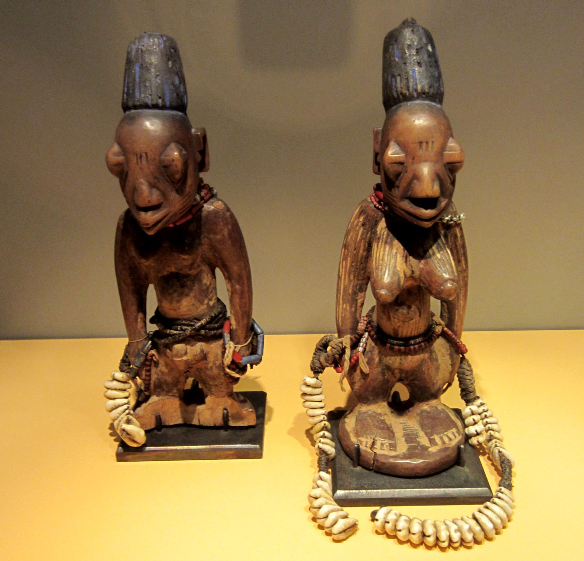 Die Zwillingsfiguren Ibedji stammen aus der Yoruba-Region in Nigeria und der ersten Hälfte des 20. Jahrhunderts. ‒ Die Skulptur einer Schwangeren wurde um 1900 in der Bamileke-Region in Kamerun geschaffen.