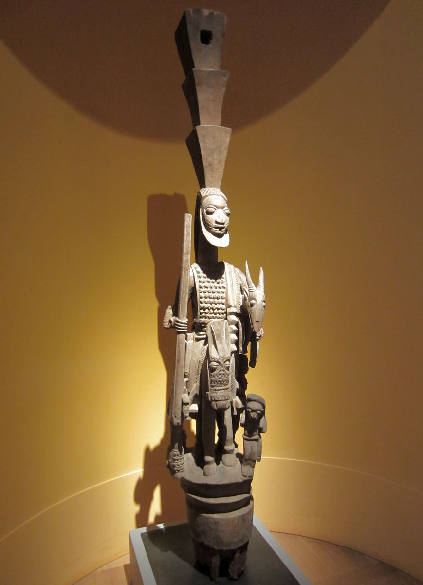 Der Yoruba Olowe aus Ise in der Ekiti-Provinz in Nigeria schnitzte den Verandapfosten vor 1938. Dargestellt ist ein berittener Jäger mit Gefolge.