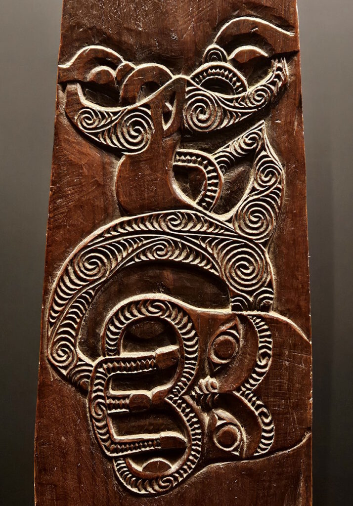 Oft zeigt das Schnitzwerk stilisierte Ahnen- und Manaia-Figuren. Bei Manaia handelt es sich um eine spirituelle Schutzfigur aus der Māori-Kultur mit dem Kopf eines Vogels, dem Körper eines Menschen und dem Schwanz eines Fisches. Manaia wird nicht nur als Schutz gesehen, sondern auch als Verbindung zwischen dem Lebenden und seinen Ahnen.