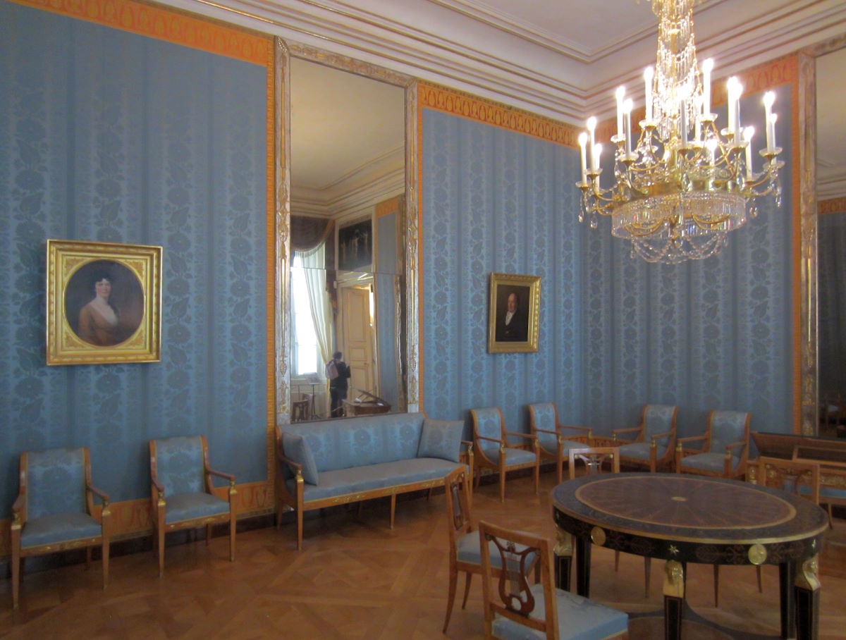 Die Wandbespannung des Arbeitszimmers der Königin Caroline im Empire-Stil wurde um 1808 von der Seidenmanufaktur Camille Pernon in Lyon hergestellt. Nachdem im Fundus der Tapeziererwerkstatt der Schlösserverwaltung Fragmente dieser ursprünglichen Wandbespannung entdeckt worden waren, konnten in einem Textilarchiv Originalmuster des Damasts und der Bordüren aufgespürt werden. So war es möglich, bei der Restaurierung des Raumes 2020 die Wandbespannung aus blauem Seidendamast mit ungewöhnlichem Sonnenblumendekor und orangegelben Bordüren fadengetreu nachzuweben.