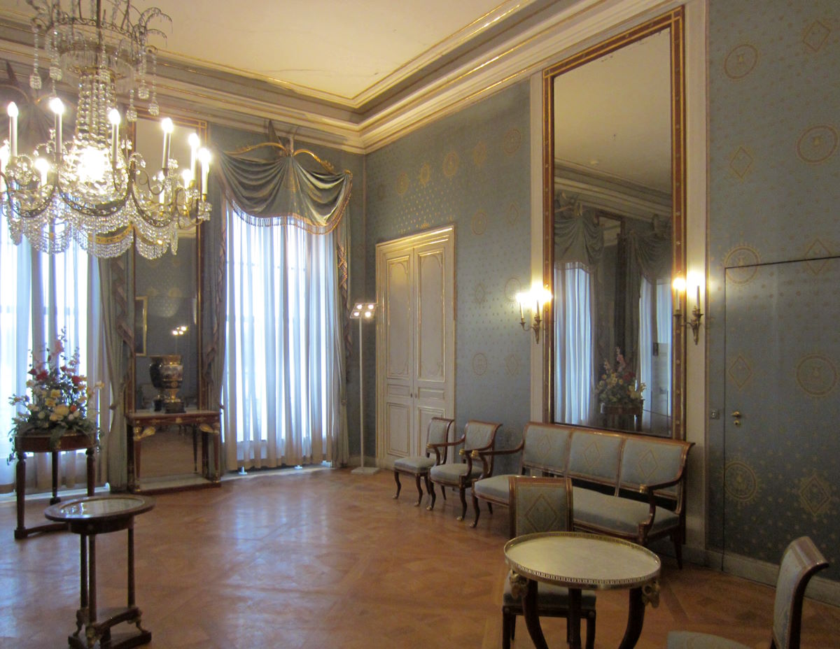 Der Hofarchitekt Andreas Gärtner gestaltete das Audienzzimmer Königin Carolines (1776 – 1841) 1806 klassizistisch. Friederike Karoline Wilhelmine von Baden hatte 1797 den 20 Jahre älteren verwitweten Wittelsbacher Herzog Maximilian Joseph von Pfalz-Zweibrücken geheiratet und wurde an seiner Seite 1799 zunächst Kurfürstin von Pfalz-Bayern und 1806 Königin von Bayern.