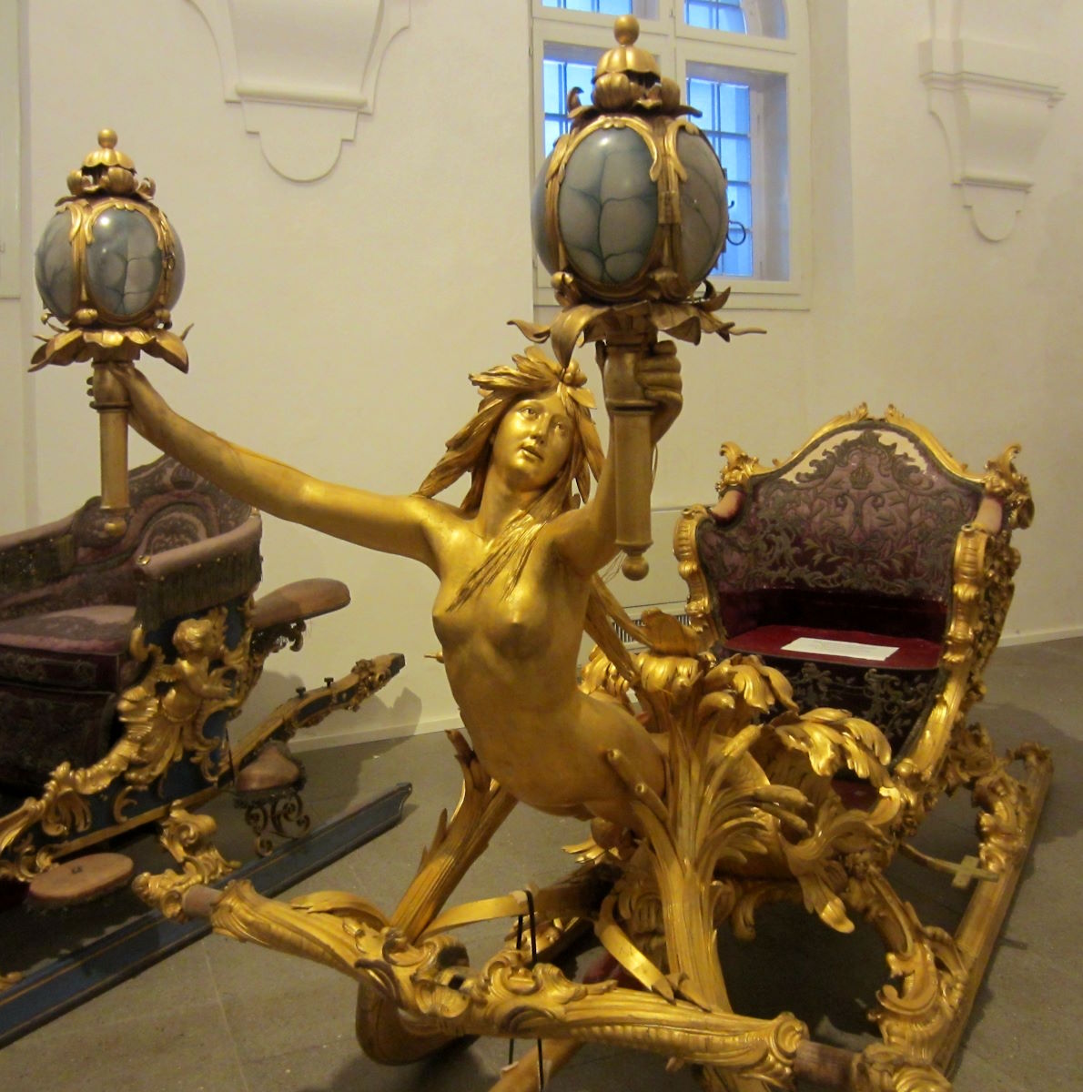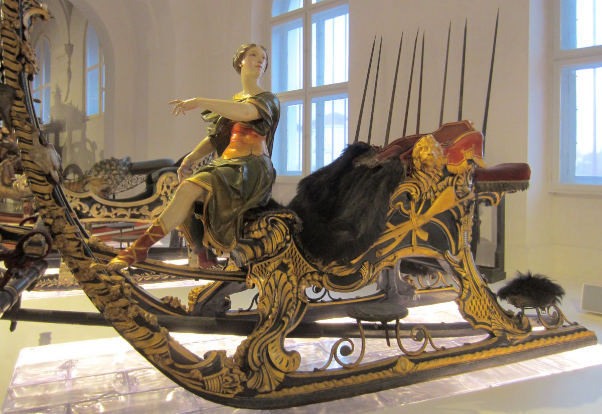 Den Rennschlitten mit der Figur der Jagdgöttin Diana fertigte die Werkstatt des Münchner Rokoko-Bildhauers Johann Baptist Straub (1704 – 1784) um 1740 im Auftrag des Kurfürsten Karl Albrecht von Bayern an.