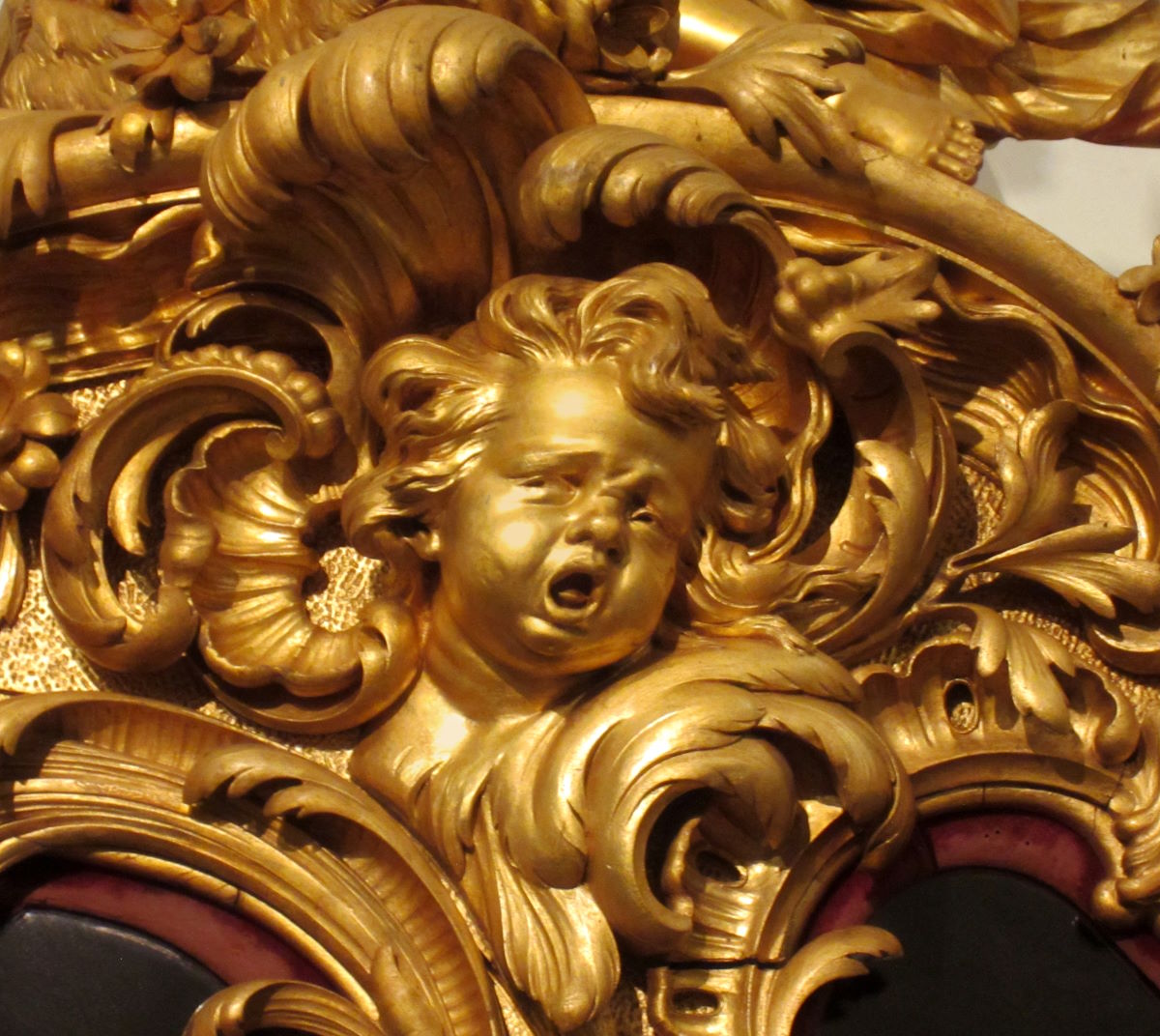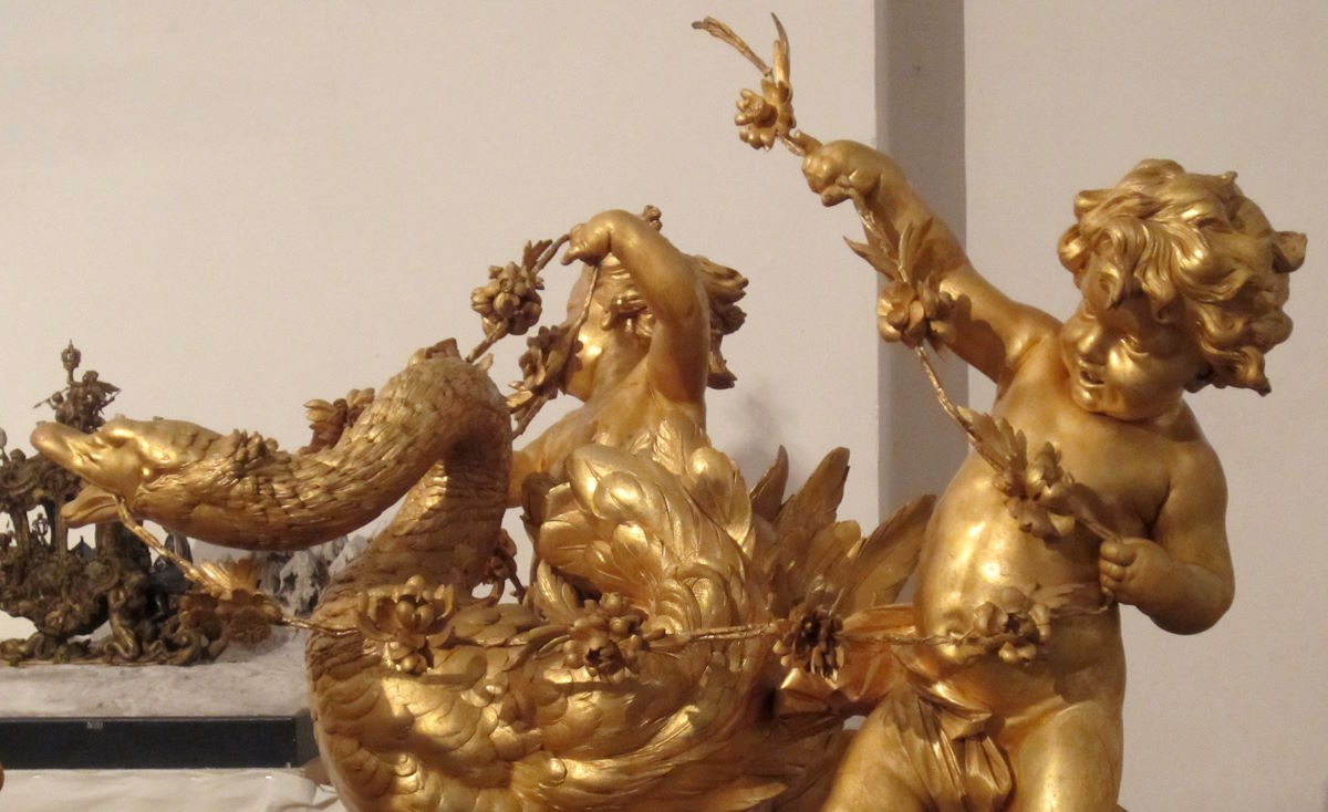 Nach einem Entwurf von Franz von Seitz (1817 – 1883) fertigte vermutlich der Münchner Gold- und Silberschmied Ferdinand Harrach (1821 – 1898) um 1882 für König Ludwig II. das Modell eines Puttenschlittens an. Es ruht auf einem Alabaster-Sockel und besteht aus Email, vergoldeter Bronze und anderen Materialien.