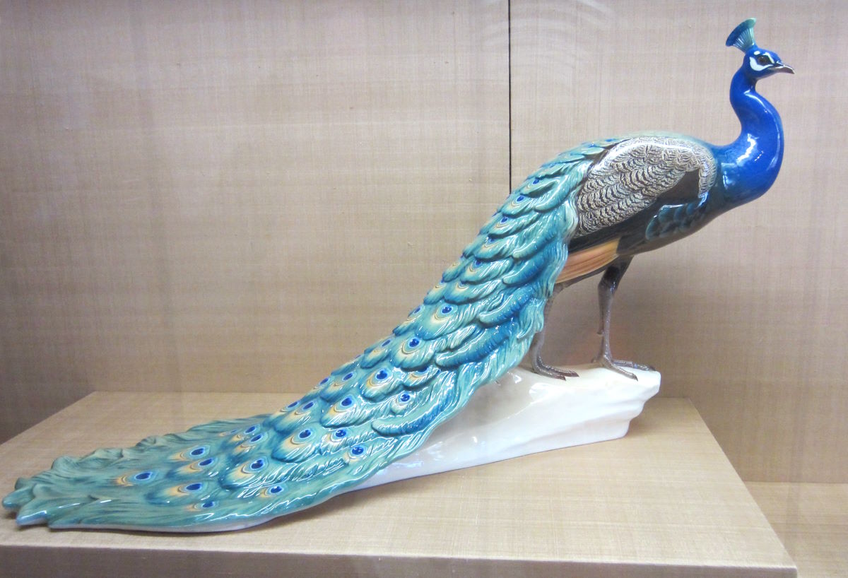 Der Pfau wurde nach einem Entwurf des Tierbildhauers und Porzellanbildners Theodor Kärner (1884 – 1966) aus dem Jahr 1905 gestaltet und 1921 von Robert Böck bemalt.