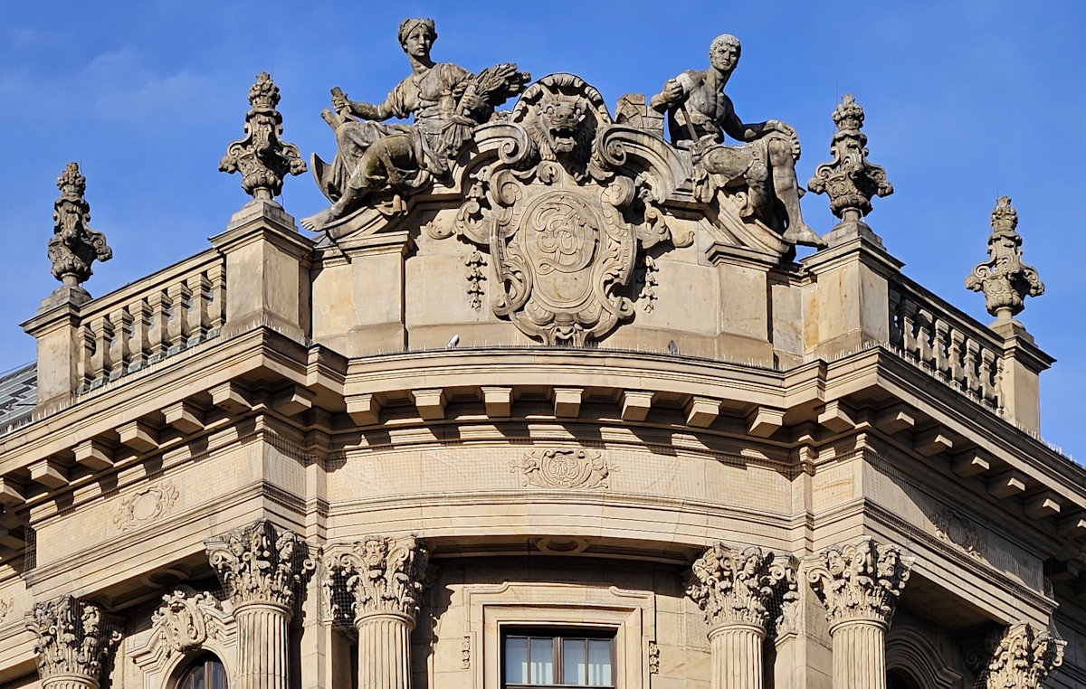 Das ehemalige Ballin-Haus am Promenadeplatz 9 wurde 1909/10 von Gustav von Cube und Karl Stöhr mit einer barockisierenden Natursteinfassade gestaltet. Die 1910 vor dem Ballin-Haus enthüllte Bronzeplastik des sich aufbäumenden Pferdes mit Reiter stammt von Heinrich Düll* und Georg Pezold*.