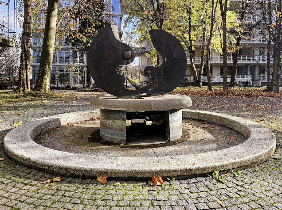 Vor dem Verwaltungszentrum der Stadtsparkasse München am Fritz-Hommel-Weg befindet sich die 1989 von dem schottischen Bildhauer und Grafiker Sir Eduardo Luigi Paolozzi (1924 – 2005) gestaltete 15 Meter breite Brunnenanlage »Polygraphia nova«, ein Geschenk der Sparkasse an die Landeshauptstadt München. Leider war der Brunnen am 13. Juni 2025 bei 27° C noch ohne Wasser.