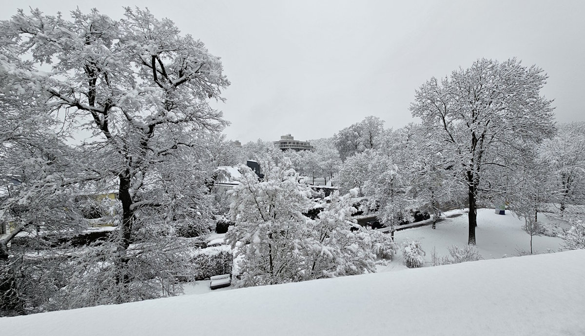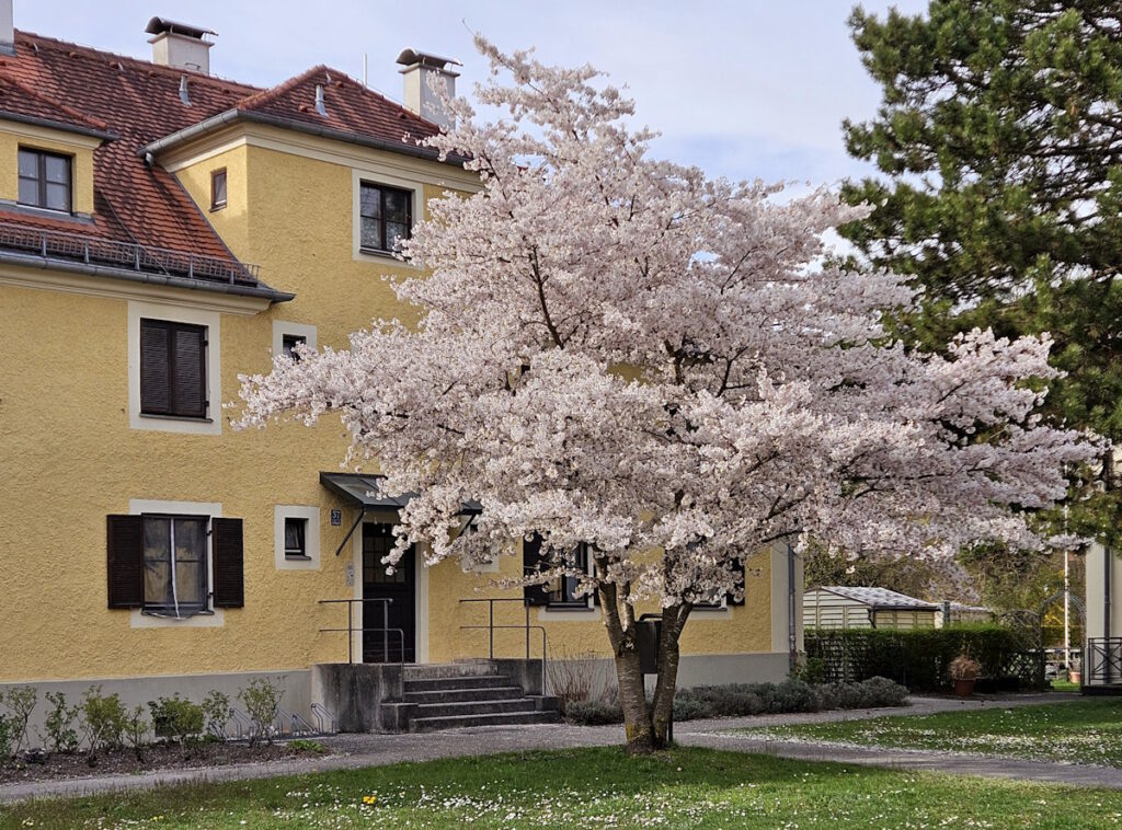 Vor dem Caritas-Altenheim St. Nikolaus in der Osterwaldstraße 25 (und im Innenhof) blühen Kirschbäume.