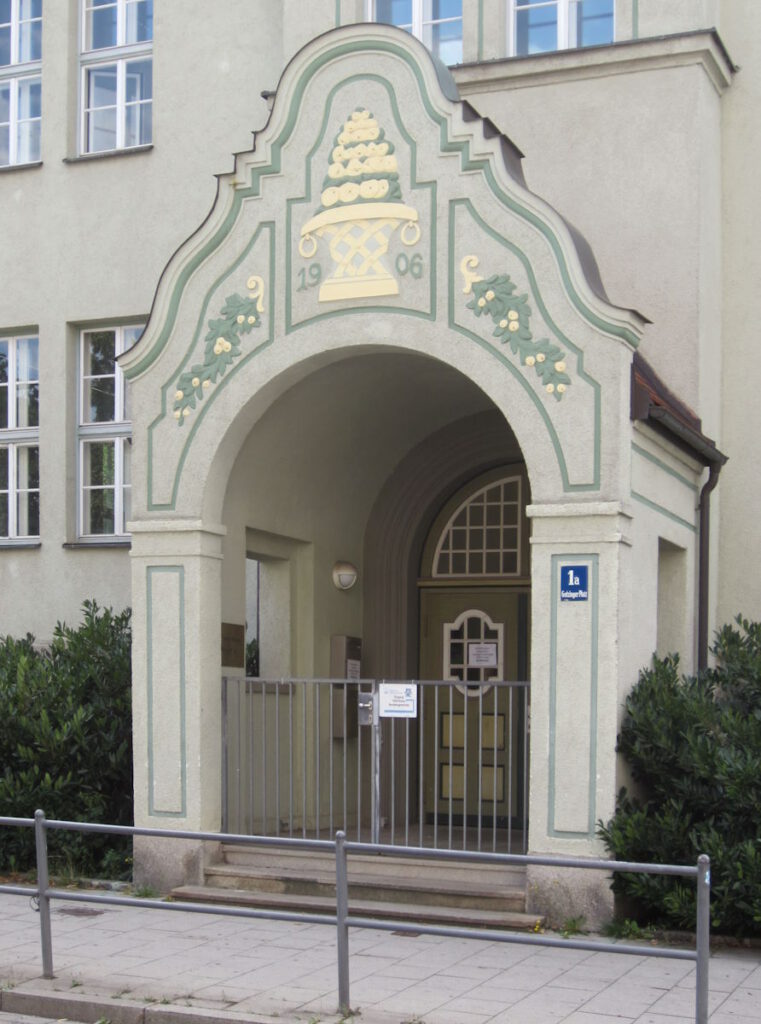 Die Schule im Süden des Gotzinger Platzes wurde auf Initiative des Stadtschulrats und Reformpädagogen Georg Kerschensteiner vom städtischen Baurat Hans Grässel 1905 bis 1907 errichtet und im Jugendstil gestaltet. 1994 bis 1999 erfolgte eine 40 Millionen D-Mark teure Generalsanierung, und im Jahr darauf konnte auch die Turmhaube, eine neubarocke Doppelzwiebel, wieder hergestellt werden. Die Schule wurde beispielsweise von 1920 bis 1928 von Sigi Sommer besucht.