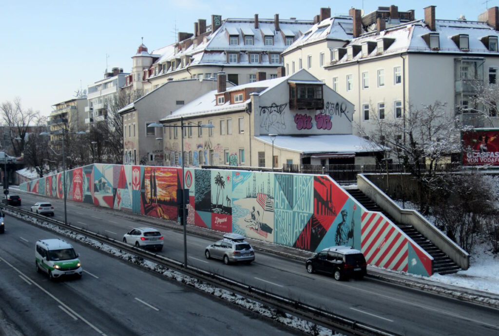 Schräg gegenüber bemalte der Amerikaner Shepard Fairey in Zusammenarbeit mit dem Team des Münchner Vereins »Positive Propaganda« 2022 eine 114 Meter lange, 500 Quadratmeter große Wand. Das Werk ist (ebenso wie sein Mural → »Paint It Black« in der Landshuter Allee) als Protest gegen die Ölindustrie zu verstehen.