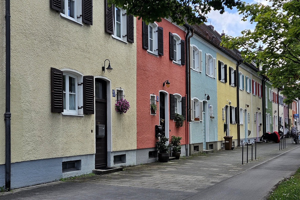 Entlang der Waldfriedhofstraße (65 ‒ 87) fällt eine Reihenhaussiedlung auf.